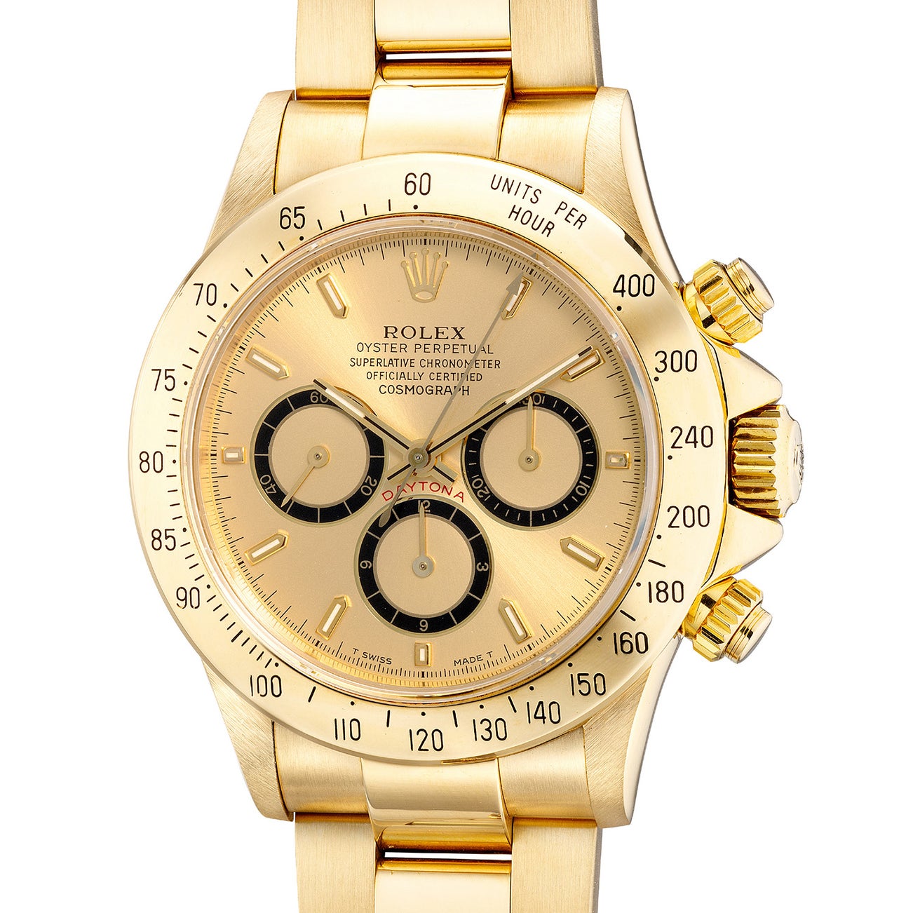 The present example ref. 16528 with an attractive champagne “inverted 6” “T Swiss Made T” dial bearing an “E” serial from circa 1991 boasts an attractive dial with no signs of imperfections. With a dial matching the warm and brilliant hue of the case, the yellow gold iteration of a Rolex Daytona will always offer a little more flamboyance than its stainless steel counterpart.