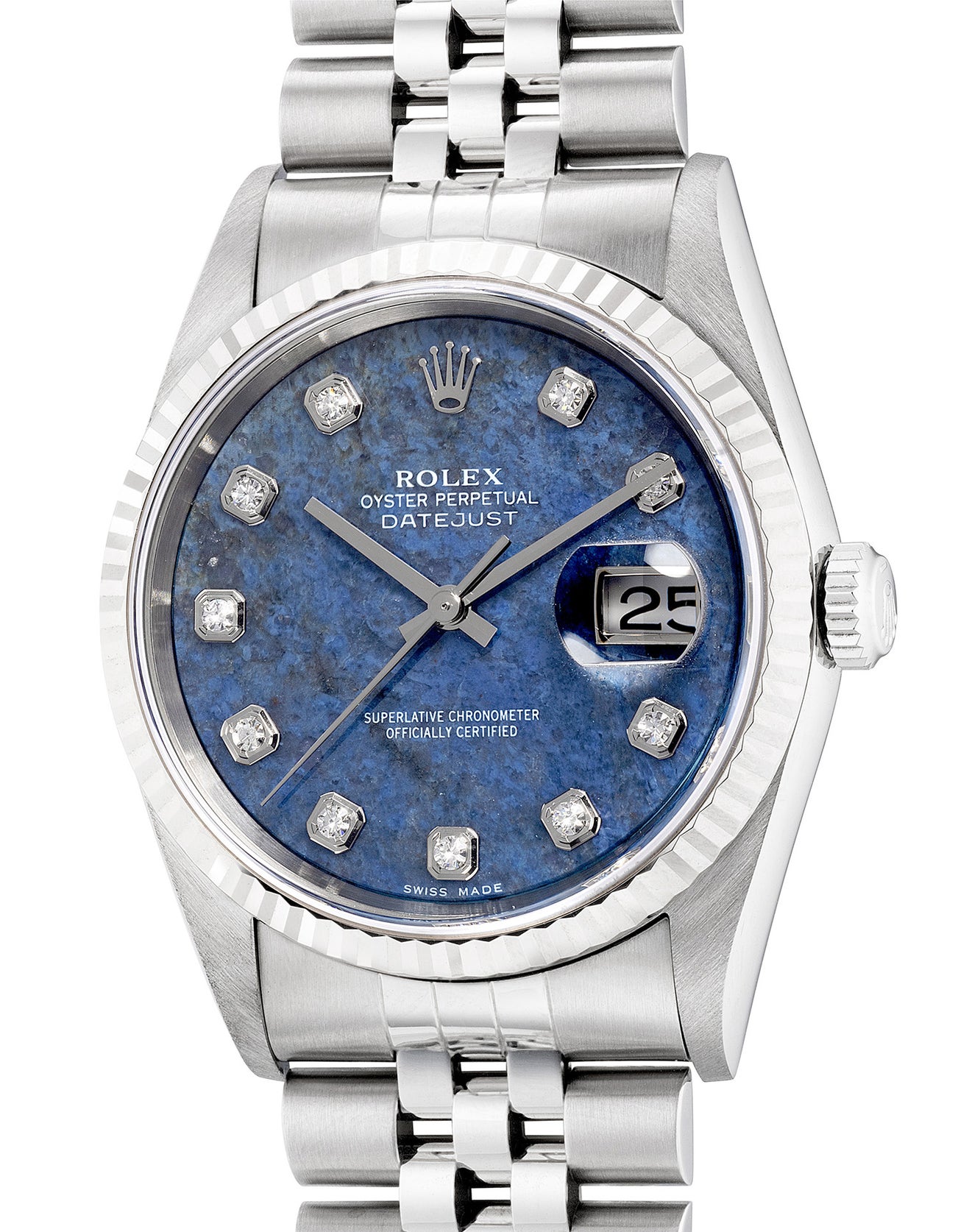 The present example in stainless steel with a white gold fluted bezel is further charmed by a beautiful and electrifying blue sodalite hardstone dial. Heightening the rarity of the reference to a whole new level, the intricate craftsmanship behind the dial requires meticulous procedures to execute due to the natural composition of the material. Measuring a 5.5 to 6 on the Mohs scale of hardness, sodalite has distinctive white mottling that can be tough to cut around without breaking the material in half during the creation of the dial. The present example is offered in excellent overall condition and has likely never seen a wrist as well as retaining its caseback sticker. A perfect timepiece for the weekend summer cruise around Repulse Bay.