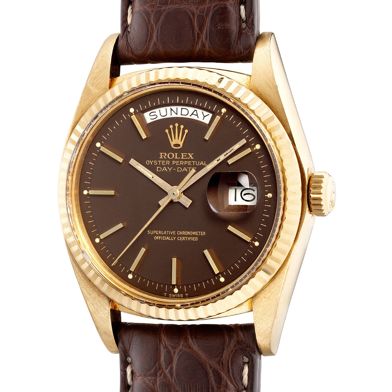 The ref. 1803 was launched by Rolex in 1960 and remained in production until 1978 and is regarded as one of the most important Day-Date references powered by self-winding cal. 1555 and 1556 for later examples. The present example in 18K yellow gold features an attractive “chocolate” brown dial that harmoniously synchronizes with the tone of the case. Extremely chic, the present ref. 1803 would be a perfect wristwatch to sport on a sunny summer weekend paired along with a loose linen shirt and a beautiful pair of Gurkha shorts.