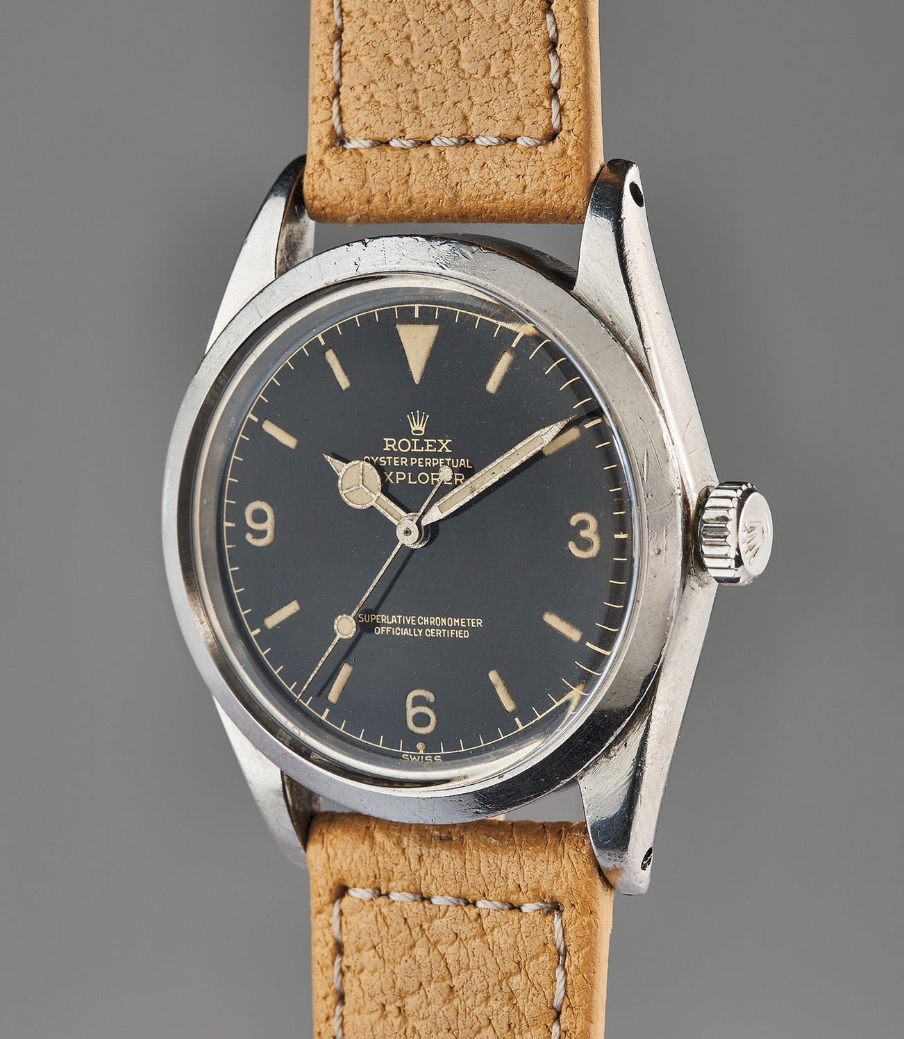 The present early ref. 1016 dates to 1963. The original and lovely galvanic black lacquer dial with gilt printing is unrestored and retaining its original glossy surface as it left the factory over five decades ago. The dial features a rare “exclamation mark” at 6 o’clock, with a small dot below the luminous baton hour marker, to signify to that tritium was used as opposed to radium. Early Explorers used the caliber 1560 like the present watch, however in the 1970s this was upgraded to the caliber 1570, which featured a hacking mechanism. Rare variants of any Rolex model always draw attention when they come to market, and this Explorer is no exception. A famed tool watch with a long and prestigious lineage, it is a watch sure to please collectors of vintage Rolex sports watches.