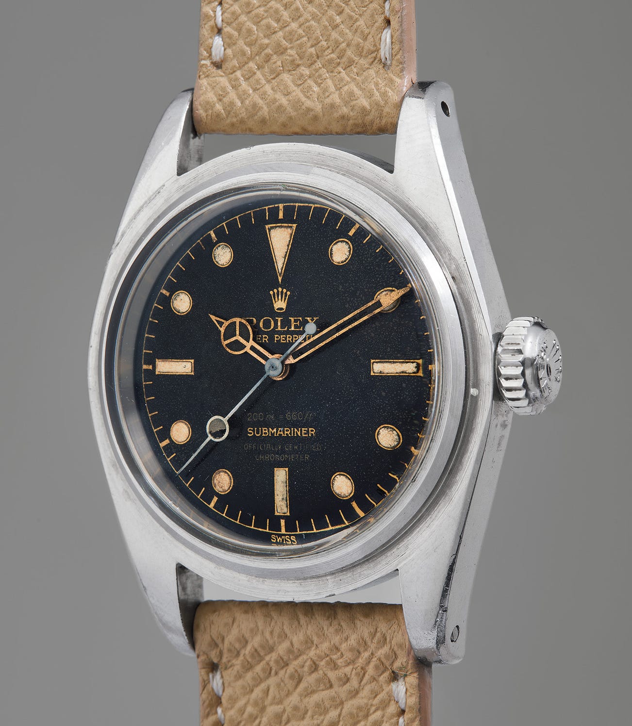 First launched in 1955, reference 6538 is incredibly desirable today due to its rarity, robust proportions, and good looks. The model was in production for four short year, and is characterized by its black lacquer “Swiss”- signed dial, lack of crown guards and 8 millimeter crown, hence its name “Big Crown Submariner”. Reference 6538 is forever immortalized onscreen, having accompanied Sean Connery’s James Bond on multiple secret missions. Bond’s chosen watch was a “Big Crown” Submariner on the films Dr. No, From Russia with Love, and Goldfinger. Consequently, reference 6538 is today also known as the “James Bond Submariner” to Rolex collectors and scholars. Furthermore, the reference 6538 was the first Submariner to be chronometer certified; hence, its coveted “four-liner” dial reflecting the designation. This example, manufactured in the third quarter of 1957, is presented “as found”, without its bezel, and in incredible condition considering its story.