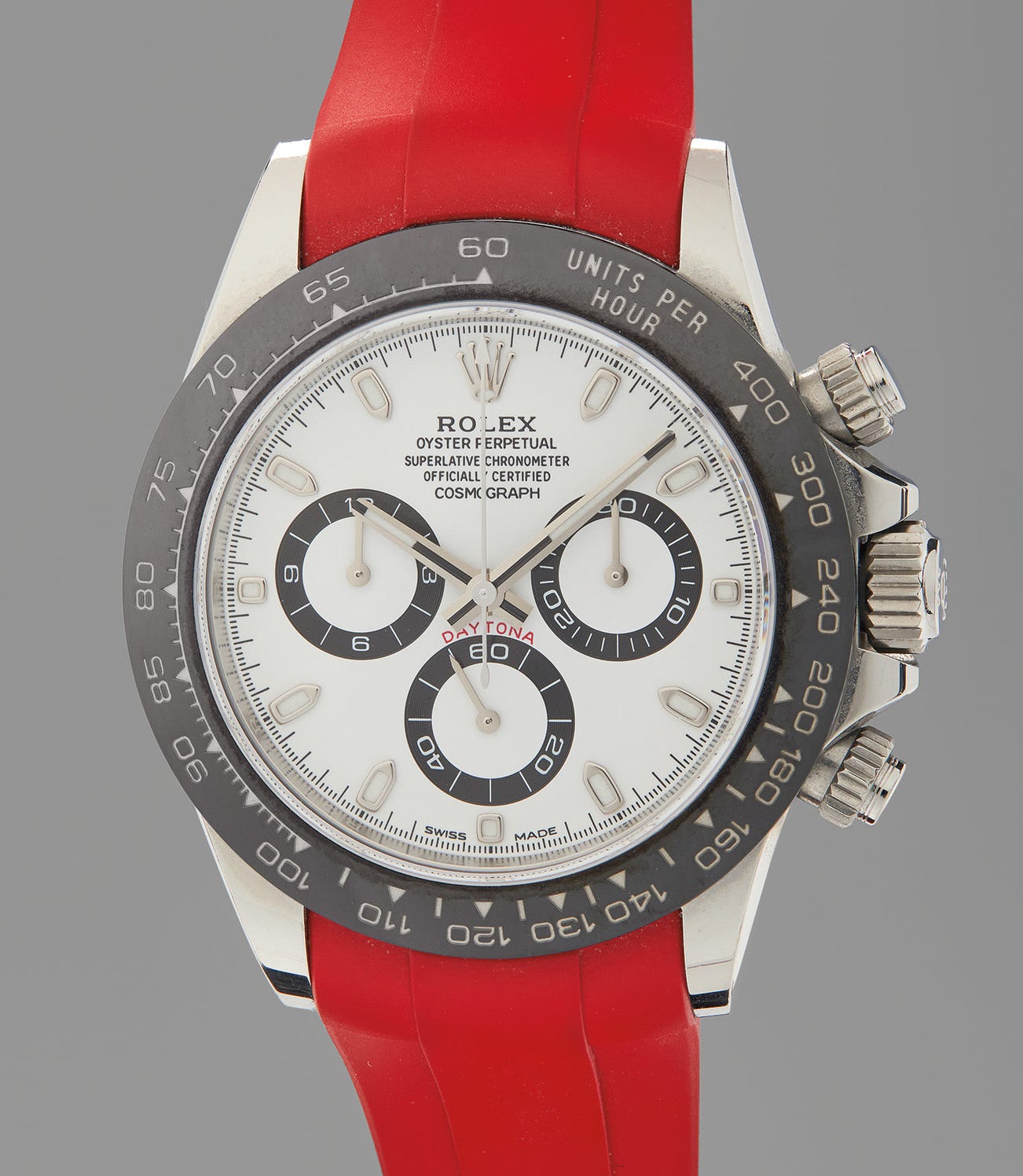 A fine and attractive stainless steel chronograph wristwatch with red strap, bracelet, guarantee, original invoice, presentation box and signed letter, donated by Kevin O’Leary to benefit the missions of One Drop and the Prince Albert II of Monaco Foundation
