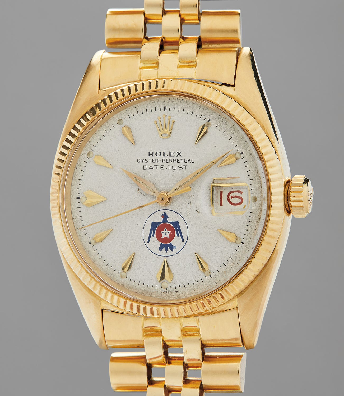 The present reference 6605, in 18K yellow gold with Jubilee bracelet, is the first ever offered publicly, consigned directly by the family of the original owner, Captain Gayle Williams, who flew in the left wing for the Thunderbirds between April 1958 and August 1959. Captain Williams, also known as “Willie”, was part of the Thunderbirds’ first East Asian deployment, a tour including Japan, the Philippines, South Korea, Taiwan, and Hawaii. During the 1959 deployment, the team flew F-100Cs, also known as Super Sabres, the Air Force’s first aircraft capable of flying faster than the speed of sound. 1959 would be the last year the Super Sabres were flown by the USAF. The caseback is engraved with Captain Williams’ name and “The Thunderbirds” written in charming period script. As a pilot and mechanic, Williams cherished the Datejust as a precision instrument, having it serviced regularly by Rolex. During one of these factory services, Rolex painstakingly restored its dial. Williams went on to serve in Vietnam, achieving the rank of Major in the U.S. Air Force.
