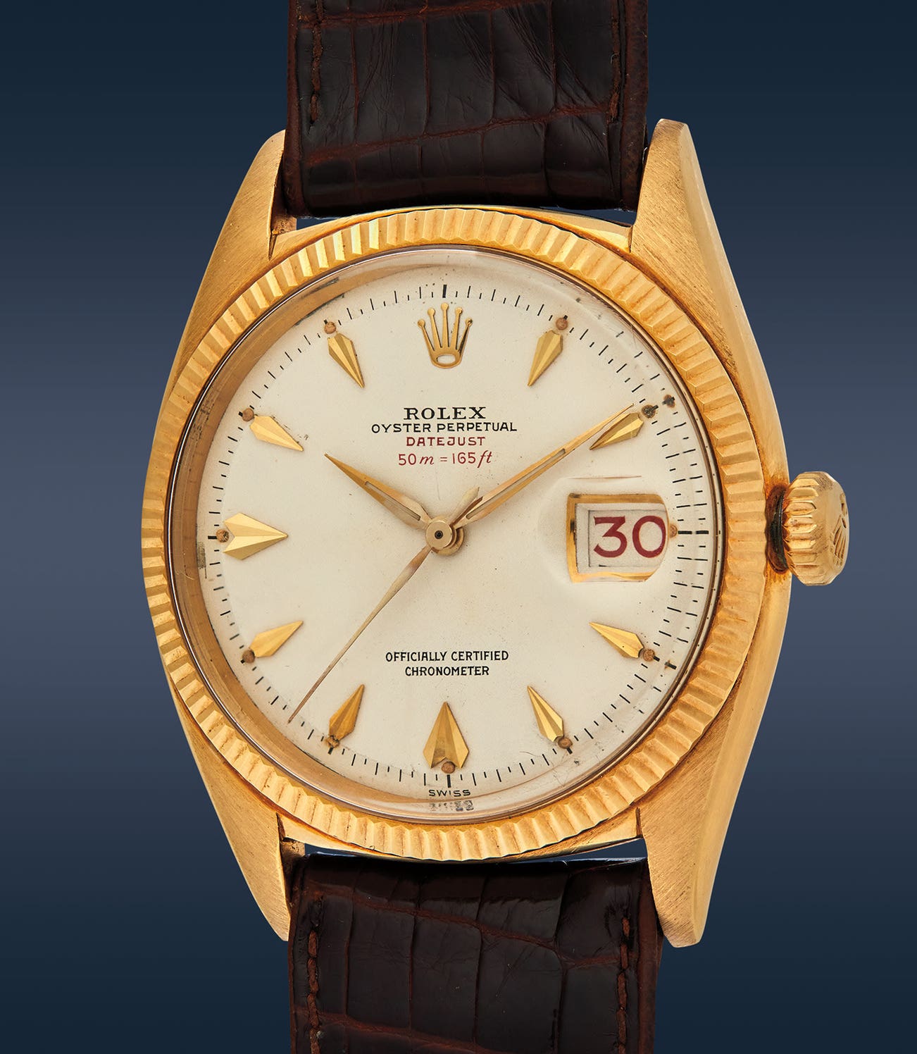 The present reference 6605 is amongst the rarest Datejust models. Made only for three years between 1956 and 1959 - together with the sister reference 6604, featuring a smooth bezel. Beautifully faceted dagger indexes and a roulette date wheel are both attractive and collectible features, but the highlight of this reference 6605 is written in tiny red text on the dial: Datejust 50m = 165ft. This designation on a non-professional model like the Datejust is an indisputable rarity, and has only been seen on a handful of vintage pieces. Many of them bear serial numbers around 11X’XXX (see the three previous Rolex Explorer “Red Depth” reference 6610s sold at Phillips) like the present example. To find one on any non-professional Rolex model is rare; to find one on an 18K gold model is truly exceptional.