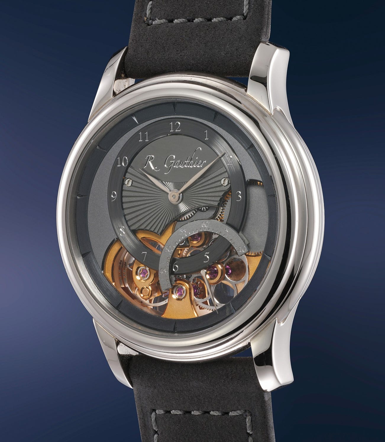 Crafted in solid 18K white gold, this Romain Gauthier Prestige HMS is a remarkable effort on part of one of the world's most respected independent watchmakers. The uncompromising approach to quality is evident throughout the construction of this elegant ‘back-winding’ dress watch. The perfect hand finishing to the movement (with Romain’s signature circle-spoke wheels) matches the two-tone anthracite semi-skeletonized dial and smooth hand-winding of the large crown. The piece is offered in close to "as new" condition and complete with its impressive original presentation box and guarantee.
