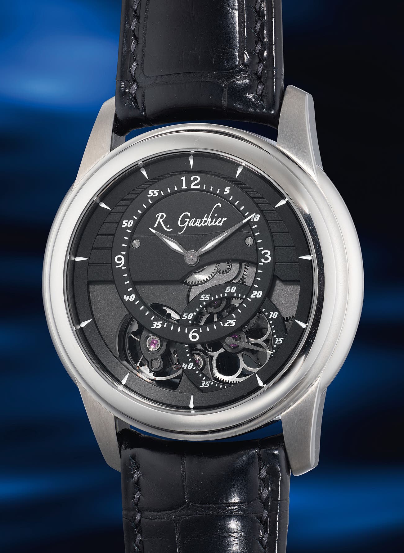 Reference MON00011 is a now-discontinued model from Romain Gauthier’s Prestige HMS collection, produced between 2011 and 2023. This timepiece exemplifies the brand’s philosophy of blending traditional Swiss watchmaking with contemporary design. Its semi-skeletonised dial reveals the balance wheel and seconds gear, creating a rich and textured visual composition. The layout features an off-centre display for the hours and minutes, while the seconds are indicated by a semi-circular arc across the lower portion of the dial.