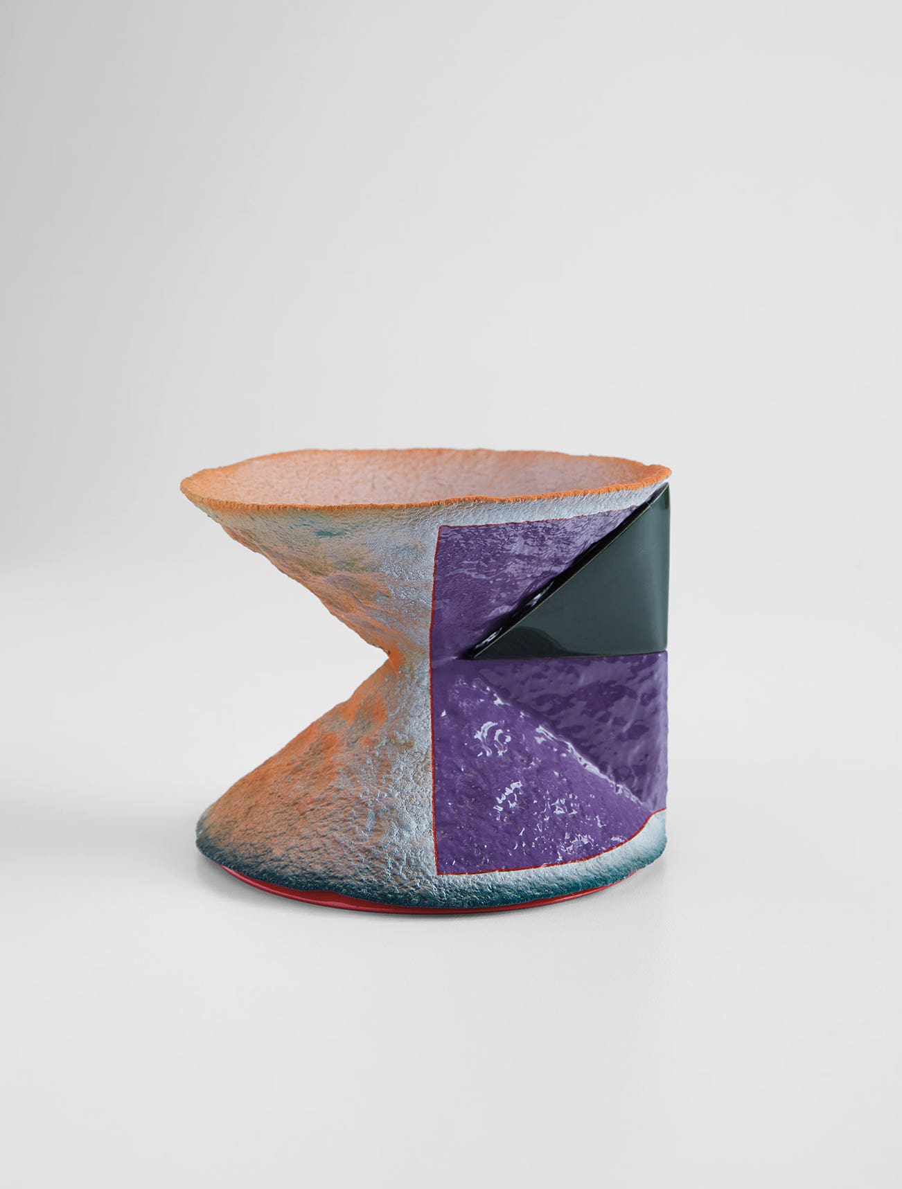 Whilst Nagle’s work can be connected to abstract high art, he is perhaps more interested in experimenting with the parlance of popular culture. Using a compressor and airbrush, he approached his small objects with the grandiosity of industrial automobile detailing. By taping and spraying his works between firings he created multiple layers of glaze, which ranged from the most vibrant primary colours to subtle, earthy hues – all characteristics that can be found in Schtub from Nagle’s ‘Small Fry’ series. As much a ceramist as he is a musician (he created the sound effects to the 1973 horror film The Exorcist, wrote songs for Barbra Streisand, and produced his acclaimed album Bad Rice in 1971, to name only some of his musical accomplishments) Nagle has compared the recording studio technique of overdubbing (layering fragments of music and voice) with his process of overglazing. Nagle’s tangible works can never be separated conceptually from his creative process as a musician and Schtub is no exception. The work is a collision of marred and glassy textures. Airbrushed blushes of pigment create surfaces with inner luminosity that resemble the mottled face of Mars in some areas and frosty powdered sugar in others. This roughness is countered by a smooth black triangle along the work’s side and a gleaming red bottom, which emulate the lacquered sheen of a hot-rod. The shape of Schtub is a classic Naglean form: the inverted mirrored cones with a vertical connecting plane is simultaneously elegant and goofy, as though a cylindrical cup was subjected to a squeeze at the waist.