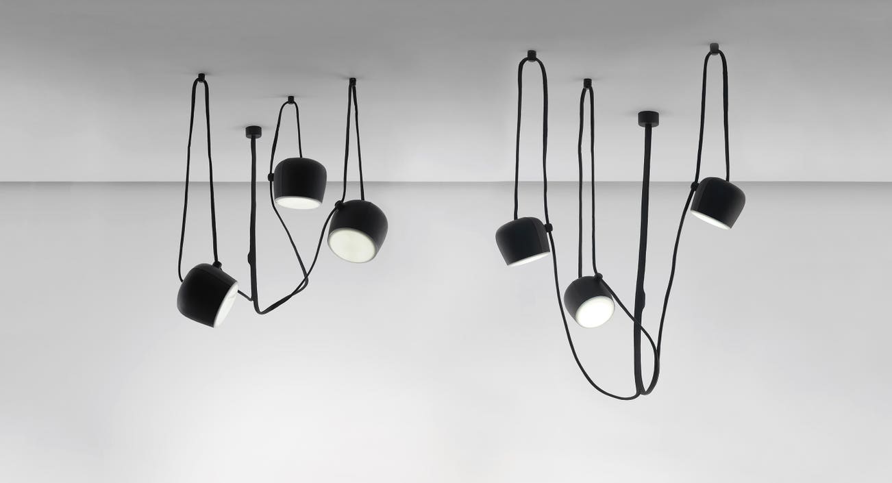 Describing the idea behind the ‘Liane’ ceiling lights, Ronan and Erwan Bouroullec explained the design was intended to incorporate and unify each element of the interconnected lights: the shades, cables and ceiling plates are covered entirely in industrial black or natural-coloured leather. The material’s adherence and the use of topstitching along the suspended electrical cables creates a natural friction that allows the user to orientate the shades without additional fixtures. Recalling the natural formation of a plant, the design can be configured to respond to a specific space. The present set of two ‘Liane’ ceiling lights are part of a limited edition the brothers presented at Galerie kreo, Paris in autumn 2009, which sold out before the exhibition opened. Ronan and Erwan Bouroullec's practice successfully encompasses both craft and industrial scale design as demonstrated by the present ceiling lights, which they subsequently developed in aluminium for industrial production for the Italian lighting manufacturer Flos.