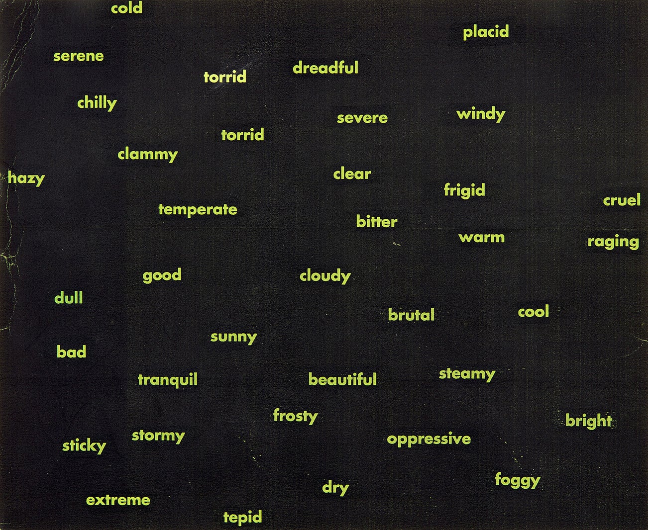 Chartreuse-color transfer-printed words, on black paper, the full sheet.