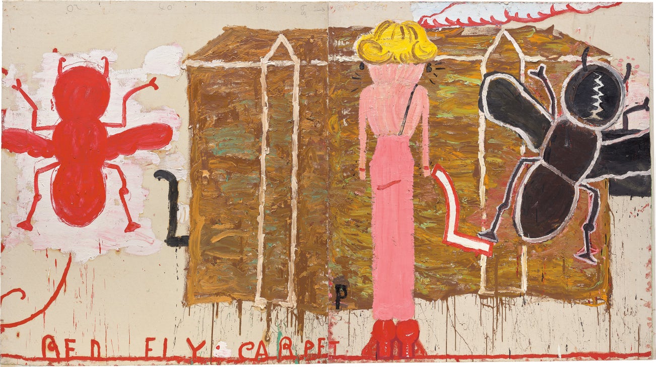 signed 'Rose Wylie' on the reverse of each part; titled, consecutively numbered and inscribed 'BLACK STRAP RED FLY [(5) (LEFT)/(6)(RIGHT)]' on the stretcher of each part