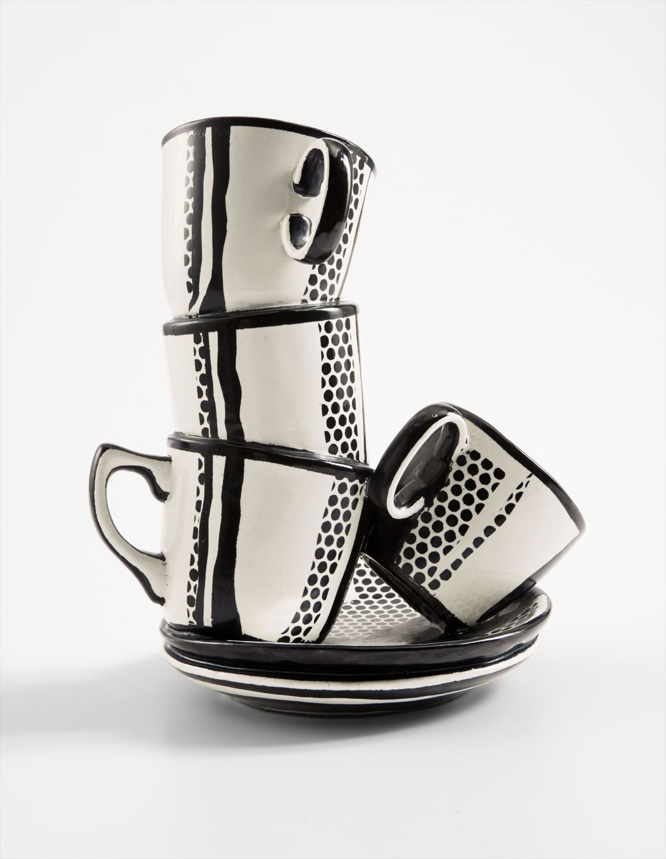 Known for his mastery of two and three-dimensional practices, Lichtenstein first began experimenting with sculpture in the 1940s and 50s, originally with more natural materials such as wood and terracotta. His style further developed in the 1960s when he started producing glazed ceramics, a surface which better allowed him to paint the graphic imagery for which he is most well-known. The repetitive nature of the dots and lines in the present lot attempt to reduce the three-dimensional objects to two-dimensional form, breaking down the sculpture into its pure graphic elements. These designs in black and white, however, distinguish this work amongst his other ceramic sculptures produced at this time, lacking the blue and red that the others feature. It is this quality that makes the monochromatic Ceramic Sculpture #7 a stronger indication of Lichtenstein’s inspiration that directly recalls the artist’s interest in newspaper advertisements, with the tower of mugs reminding the viewer of a black and white ad from the Sunday paper. In this way, Lichtenstein connects with the American consumer on an even more direct level, overtly challenging this notion of pop art—the mundane can be celebrated in the simplest of forms, and further, can be elevated to the highest form of art.