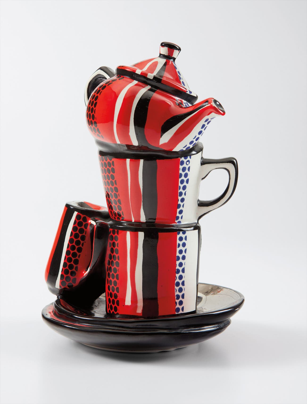 Painted in vibrant blues and fiery reds with glossy blacks, whites and reflective silver, Roy Lichtenstein’s Ceramic Sculpture #16 recalls the familiarity of consumerist objects that harken back to American diner culture of the 1960s. Executed in 1965, right at the time when the artist started regularly working with sculptural media like ceramic and enamel, the present lot reminds us of the power of paint. With his characteristic Ben-Day dots and blocks of color, the artist breaks down the three dimensional form of a leaning tower of cups and saucers into its graphic surface elements. In the early 1960s, Lichtenstein began working in ceramic, a surface which better allowed him to paint the vibrant graphics for which he is most well-known. In the present lot, these graphics are particularly striking, as rich blocks of color interact with metallic silver. On one side of the sculpture, the viewer is confronted with a reflective silver surface, juxtaposed with repetitive, deep blue Ben-Day dots that are themselves interrupted by wavy, imperfect red and black brushstrokes. On the other side of the sculpture, the elements are almost entirely painted over in a vibrant red, atop which are black Ben-Day dots. This unique blending of mechanized repetition with abstract brushstrokes mimics the same paradox that exists in the work itself. While confronted with a recognizable symbol of low culture, viewers are simultaneously faced with the sculpture’s lack of functionality and in turn, characterization of a high art object.
