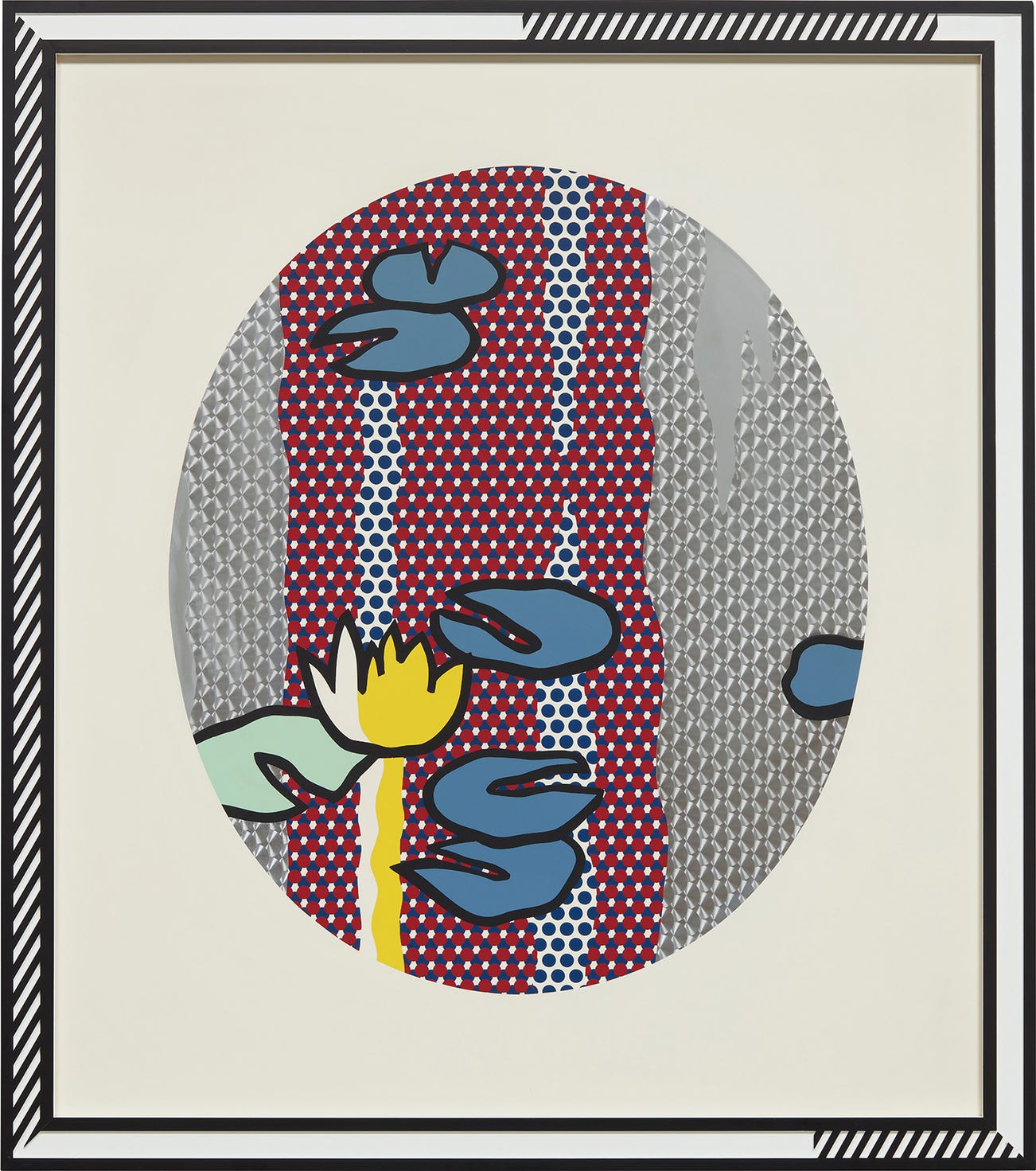 Color screenprinted enamel on processed and swirled stainless steel, contained in the artist's painted relief wood frame.