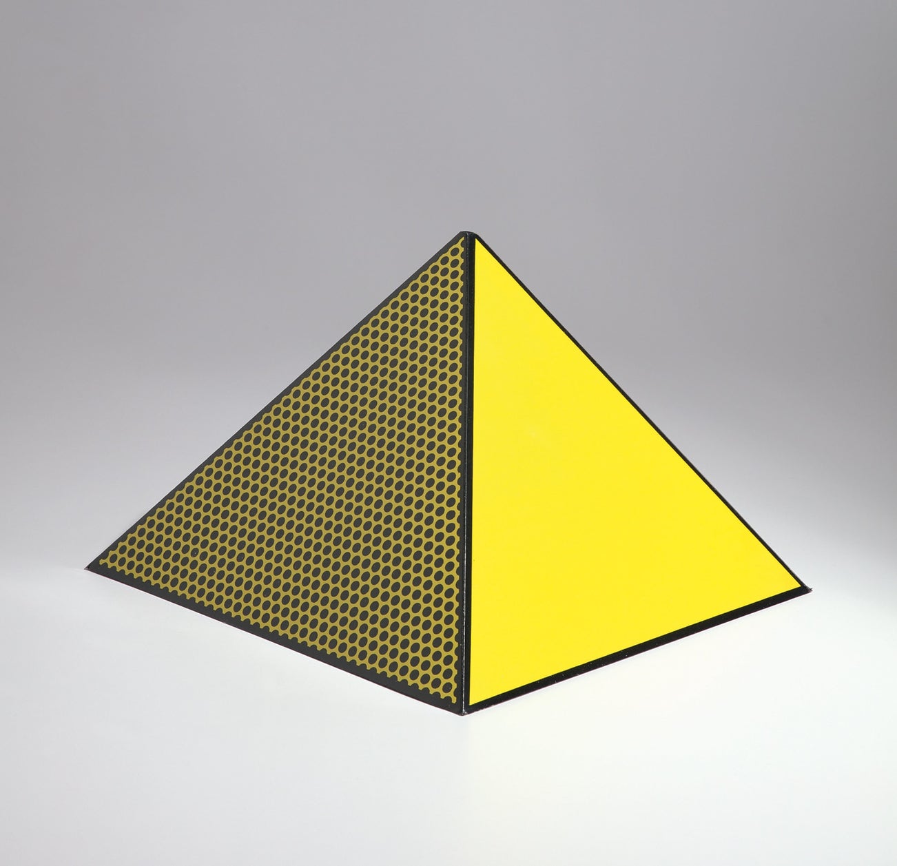 Screenprint in yellow and black, on lightweight board folded into a three-dimensional pyramid.