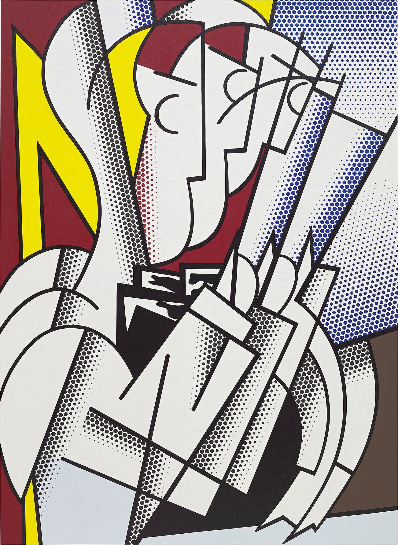 Reinterpreting Severini’s painting using his distinctively unmodulated colours, Ben-Day dots and a firm network of intersecting arcs and lines, Lichtenstein halted the image, suspending the futuristic sense of rapid motion. Instilling the work with renewed movement through the gradated Ben-Day dots, the artist placed the composition within his distinctly pop aesthetic. Lichtenstein’s monumental painting bridges the tense realm between originality, homage and imitation, moving beyond the pixelated ideals of his earlier comic book paintings, yet raising similar questions of legitimacy, parody, pastiche and transformation within artistic creation. In his earlier examinations of modern art as a subject matter, Lichtenstein became particularly engaged with the work of Picasso, completing a number of paintings after the Cubist master and noting that, ‘Picasso’s always been such a huge influence… I don’t think that I’m over his influence’ (Roy Lichtenstein, quoted in David Sylvester, Lichtenstein: All About Art, London, 2003, p. 58). The present work, with the musical undertone of the conductor, echoes Picasso’s Pierrot as Orchestra Conductor, 1920-1923, a fragmented stencil of overlapping planes that precedes the present fusion of Pop Art and Futurism. Here Lichtenstein’s vast repertoire of source material and multifarious influences come to the fore.
