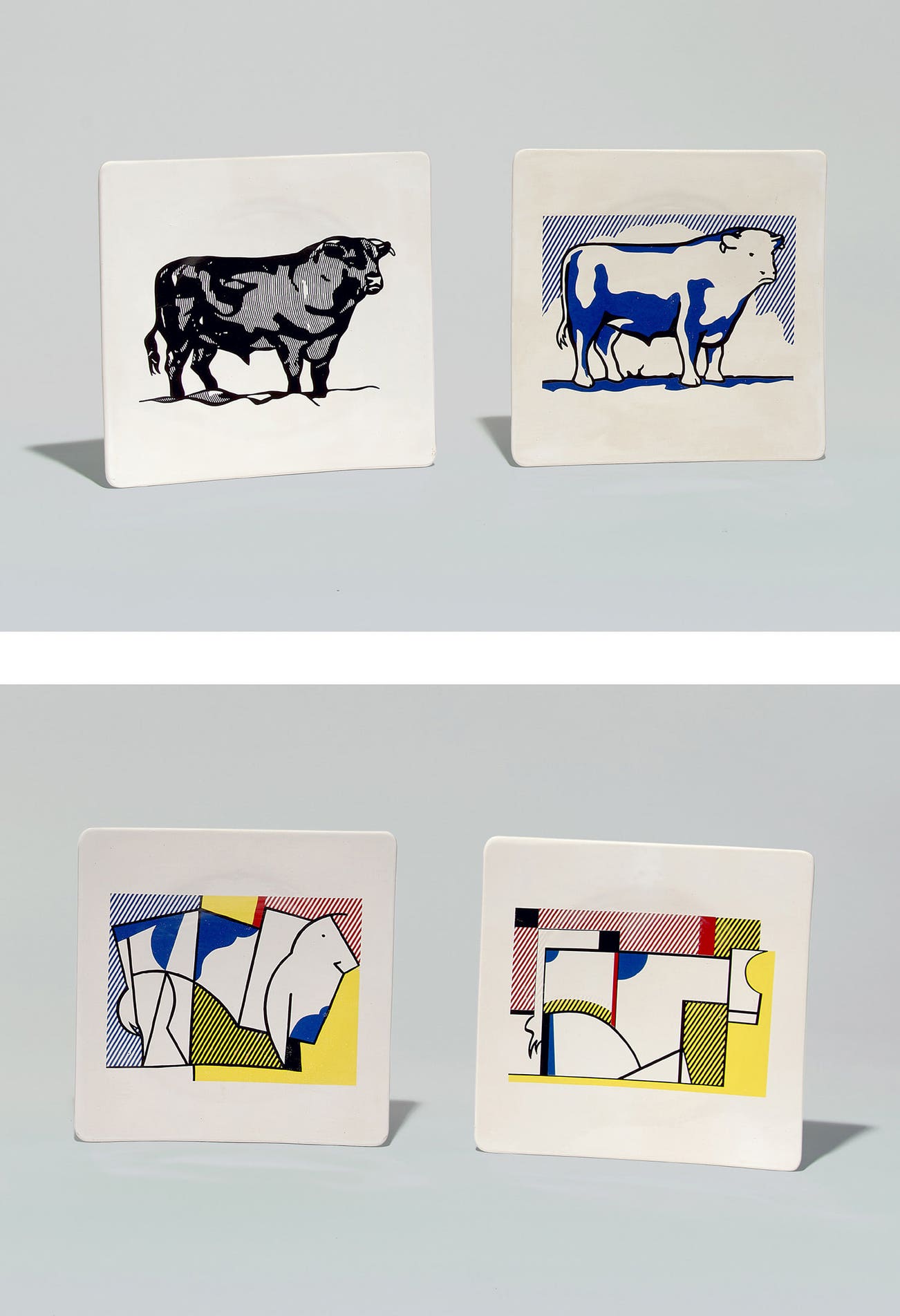 Four screenprints on glazed porcelain plates, lacking plates five and six and the original cardboard box.
