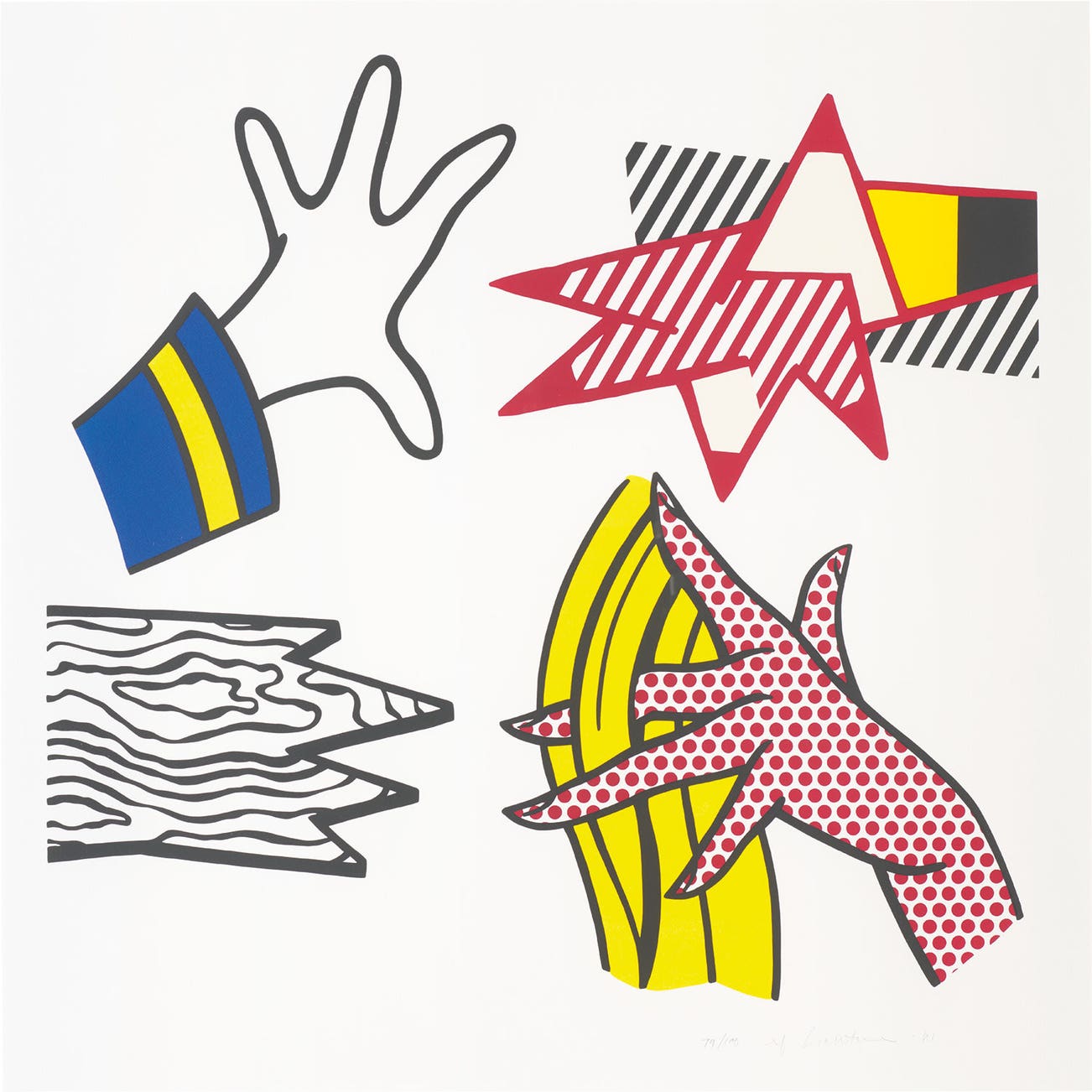 Signed, dated and numbered 79/100 in pencil (there were also 24 artist's proofs), published by Castelli Graphics, New York, to accompany the special edition of the exhibition catalogue for Roy Lichtenstein 1970-1980 at the Saint Louis Art Museum, framed.