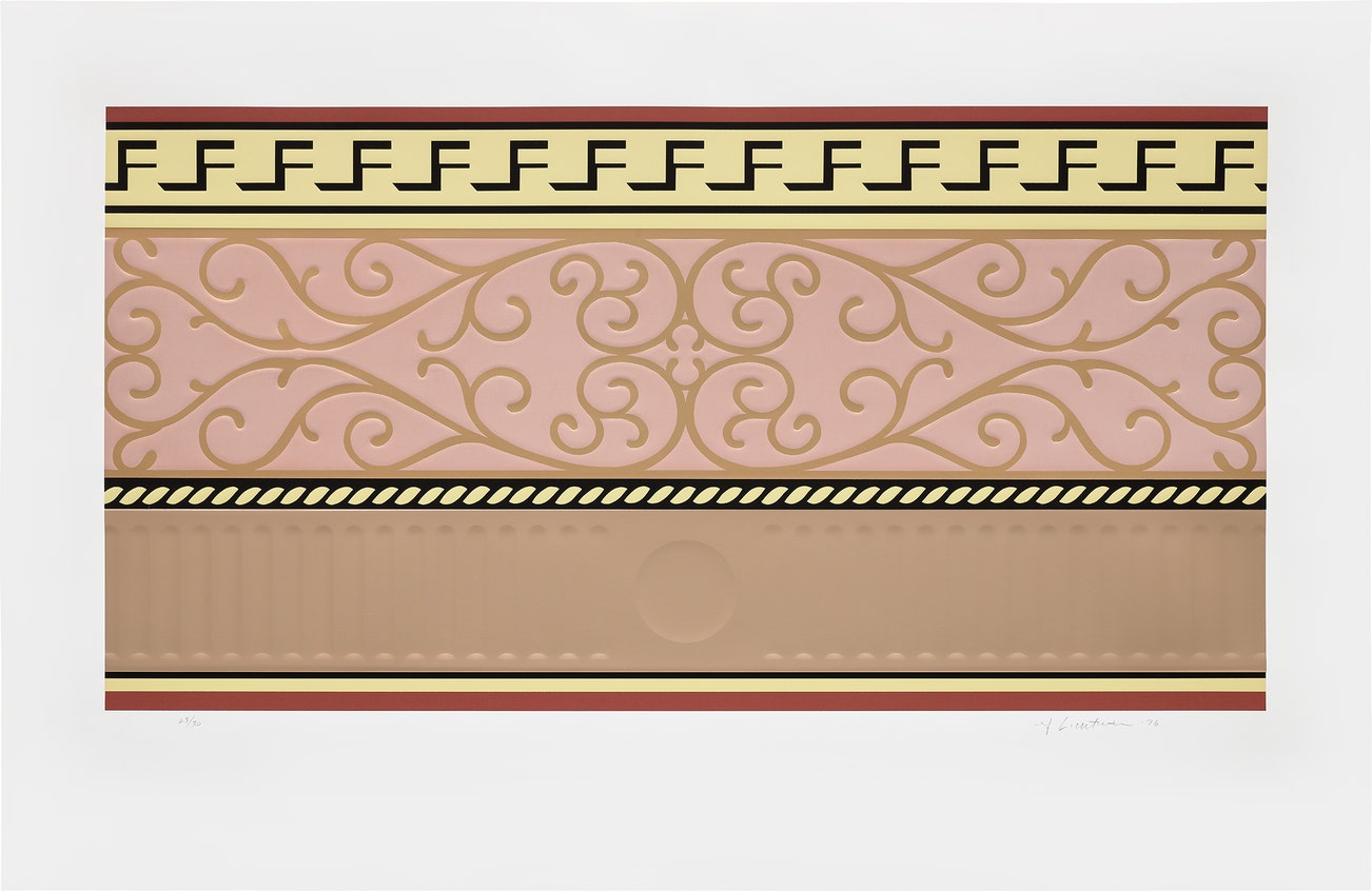 Screenprint in colors with embossing and collage of gloss copper and mat pink metallic foil, on Rives BFK paper, with full margins.