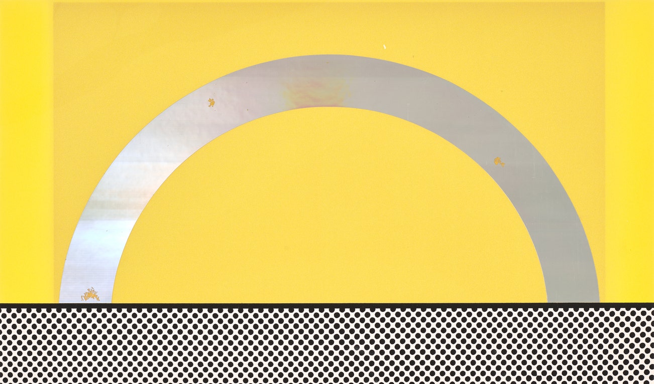 Screenprint in colours with collage of iridescent silver Mylar, on 4-ply rag board, the full sheet.