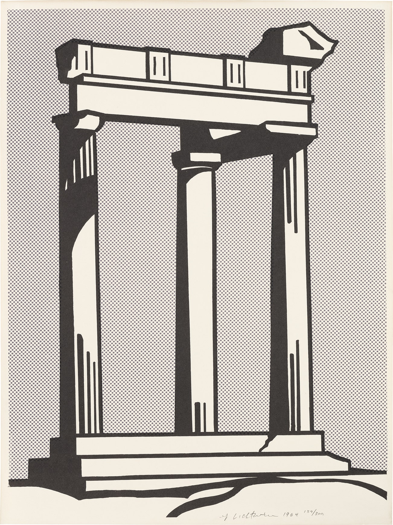 Temple was also printed as an unsigned mailer to announce Lichtenstein's exhibition Landscapes at Leo Castelli Gallery from October 24 - November 19, 1964.