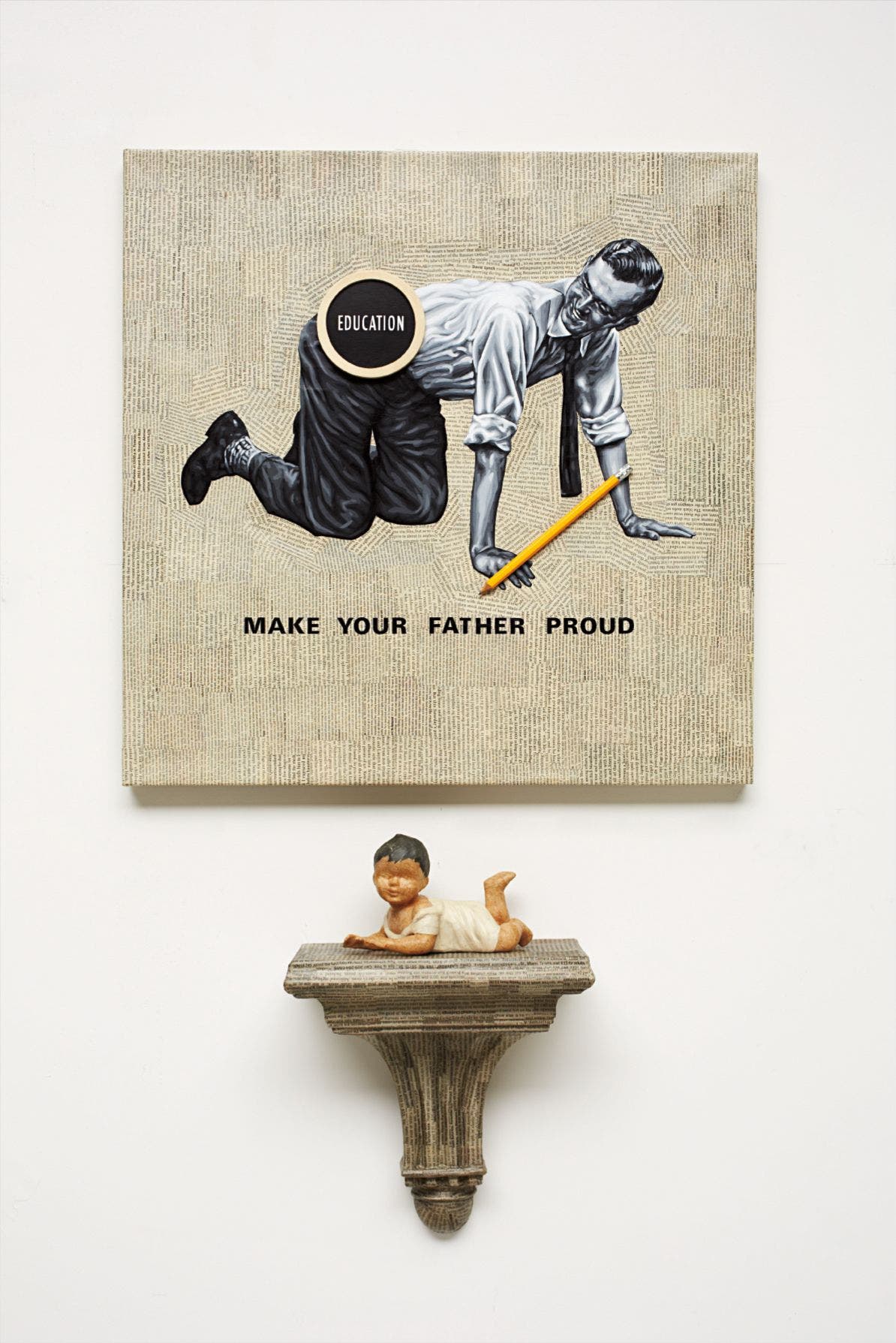 acrylic, newspaper, and found objects collage on cloth, newspaper collage on found wooden shelf, newspaper collage on found doll