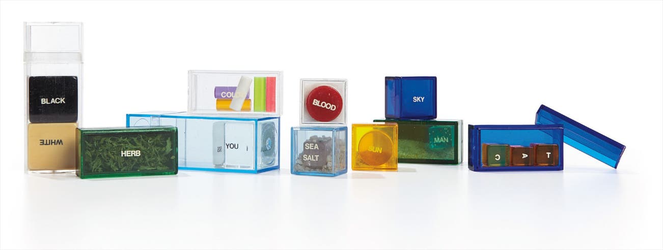 set of acrylic boxes with herbs, sea salt, sand and dice, in the artist's wooden box