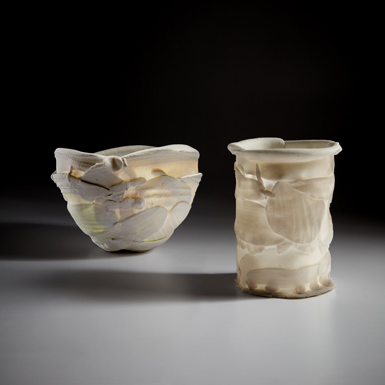 Unglazed porcelain, handbuilt from overlapping elements.