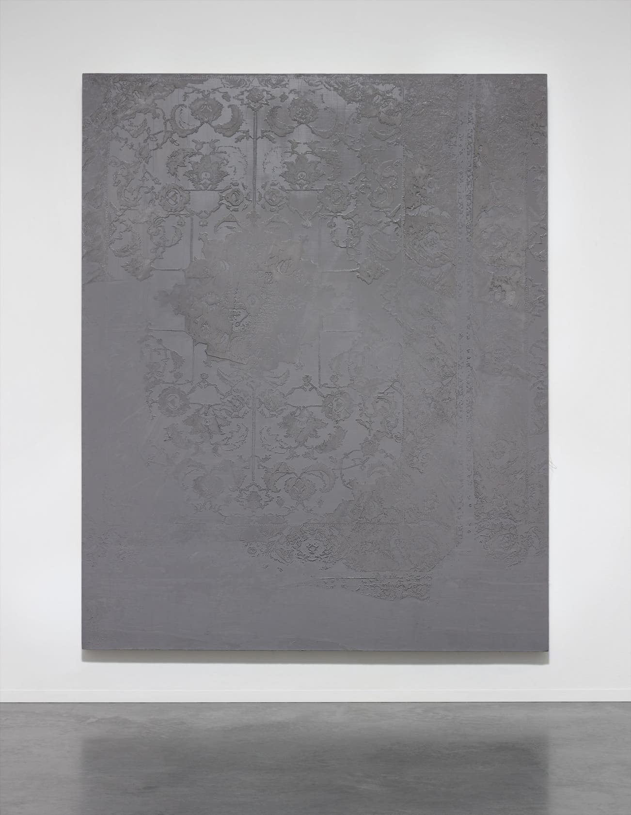 Since the Renaissance, oriental carpets have been a sophisticated and luxurious element of design for royal and religious interiors as many paintings by Lotto, Bellini and others testify. Oriental carpets were associated with wealth, class and power. At the same time embroidery is connected to craft, domesticity and femininity, all aspects that contrast the opulence of the large size canvas on the wall. The monochrome disrupts the traditional grisaille paintings and the modernist fascination with a single colour on the canvas. The silver colour in particular clashes ideas of decadence, preciousness and asceticism together. The use of the silver hue is here re-invented in an ironic key: the spiritual associations are brought down to the everyday world. Furthermore, the use of monochrome plays with Piero Manzoni’s Achromes by inverting the artist’s own statement: "anything superfluous and all interpretative possibilities are excluded (from the canvas)."