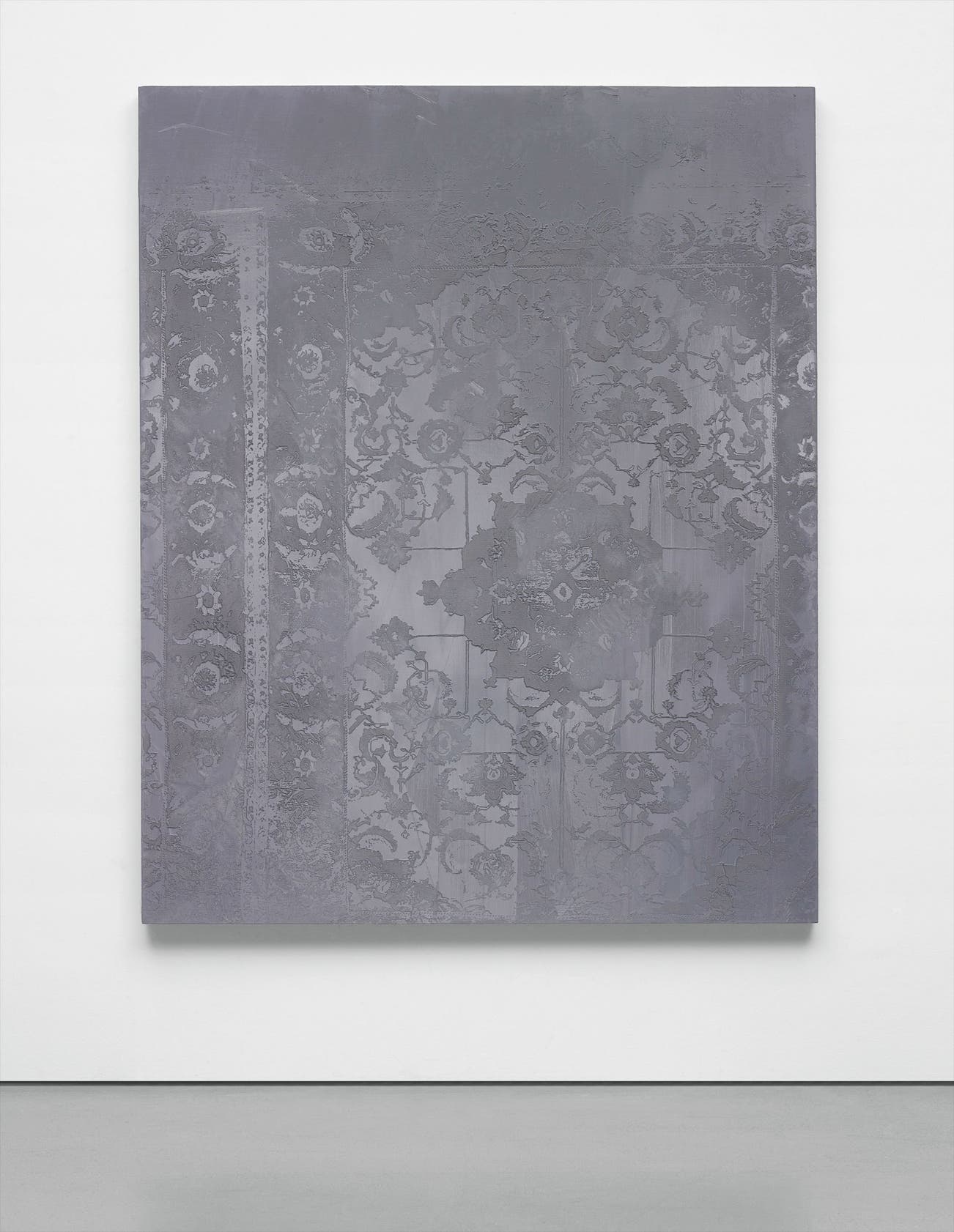 Beyond the intricate texture of the painting’s surface and the legacy of the original object, the present lot’s chromatic presence is imposing, to say the least. While many of his paintings take on a lighter sheen, Untitled, 2010 has a profound power with its deep steely gloss punctuated by sections of greater reflectivity. The elaborate floral pattern of the original carpet is clearly visible at all corners of the piece—we find the same circular motifs occupying separate sections of the picture, a testament to the rigid symmetry of the original carpet. Upon closer inspection, we can spot partitions in the arrangement of forms, in these places, Stingel uses the same print in direct proximity to itself. This may come as a surprise, perhaps, for the hypnotic beauty of the piece steals our eyes away from the particularities of the pattern and towards the more powerful impact of the work as a whole.