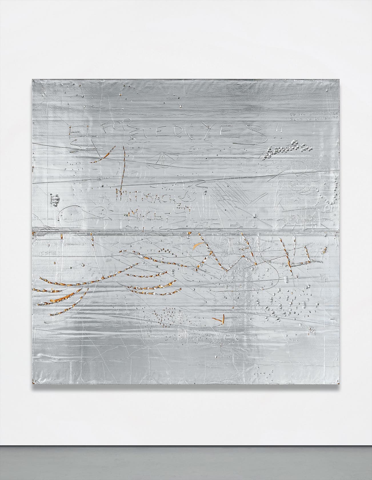 Offering the pristine silver surface to the emotional instinct of any viewer is both an act of total defiance and of absolute courage. The embracing power of Jeff Koons shiny colored stainless steel finds in Stingel’s Cellotex room to work its final closure. The viewer does not simply enter the work through the reflecting surface, but they do physically and almost sexually. The Cellotex are not about the power of images but about the power of creating both images and signifiers.
