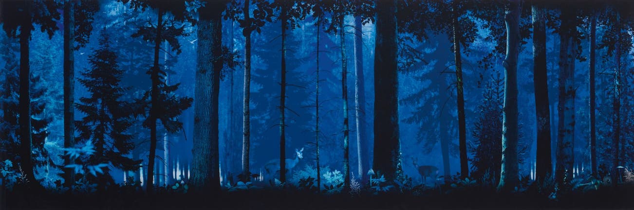 Ruud van Empel continues to explore themes of childhood and storytelling in his Theatre series (2010-13). Measuring three metres in length, the monumental scale of Theatre #7 transforms the space in which it is exhibited into a theatrical set. The blue colour spectrum evokes twilight and creates a scene that appears serene and eerie at the same time.