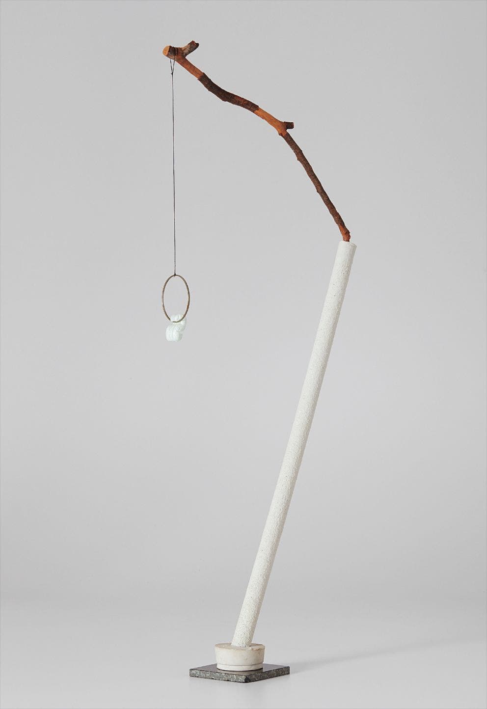 tree branch, metal hoop, Styrofoam, granite, metal hoop, plaster and string