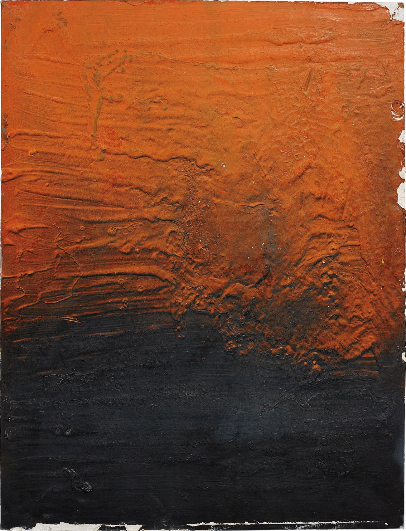 In title, the present lot, September 1, 2009 - February 11, 2010, charts the exact dates of the painting’s progression from a sparse blank canvas to a radiating picture of brilliants peaks and valleys. By continually smearing layers of paint and latex upon the horizontally placed canvas, Sullivan allows the composition to form naturally over time. He explains that is he has “always found the gesture in the hand to be incredibly problematic in painting. ….a big focus of mine was how to remove the hand from painting. I'm guiding the paint but there's no brushwork, there's no signature going on." (Ryan Sullivan in C. Bollen, “Art Ryan Sullivan,” Interview Magazine, 2013) September 1, 2009 - February 11, 2010, records the ripples and cracks of a rough terrain; executed in shadowy black and a burnt orange, the canvas is reminiscent of a fiery, singed, volcanic surface. Sullivan explains that the unpredictability of this stunning visual outcome “is not so theoretical. It's not preordained. I want to take a lot of time to let stuff happen, basically….When you have wet paint and dry paint and layers moving, it's something that I'm responding to." (Ryan Sullivan in C. Bollen, “Art Ryan Sullivan,” Interview Magazine, 2013) The final visual result is one of swelling texture; the applied latex forms an oil paint skin over the canvas that maps the vulnerable evolution of Sullivan’s artistic process.
