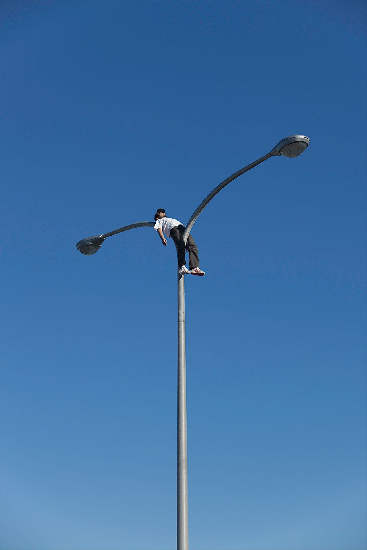 This seemingly simple photograph of a man reclining on top of a lamppost was made by free climber turned artist Ryota Kikuchi. The man in the photograph is Kikuchi himself who has free climbed approximately eight metres up this lamppost in his hometown of Chiba, Japan. With his climber’s trained eye, he identifies the urban setting in which to intervene and then maps out the best route. Kikuchi initially took up photography to document his climbing then soon discovered the potential of the medium as a form of expression. After receiving his MA in Intermedia Art from Tokyo University of the Arts, he began to use his unique perspective as a free climber to explore hidden boundaries within the urban landscape, expanding his personal map of the city. In addressing the element of performance in his work, the artist comments, ‘I choose to quietly take part in a performance, which I document as a photograph. It is a personal adventure.’ He continues, ‘I hope my work gives people a fresh viewpoint of ordinary cityscapes and landscapes.’
