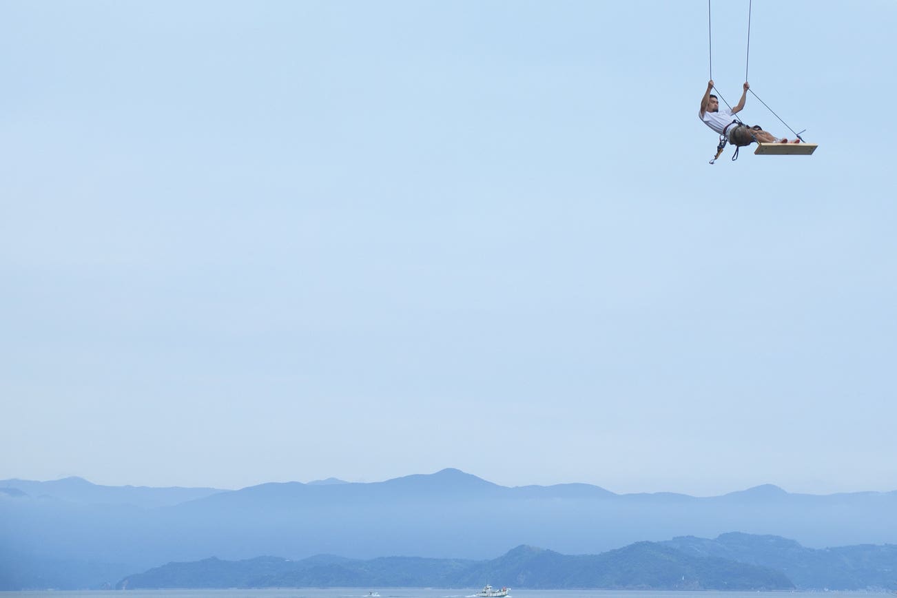 Swinging high above the skyline, free climber and artist Ryota Kikuchi is pictured here in a spellbinding self-portrait over Uwajima on Japan’s Shikoku island. Known for his gravity-defying performances, Kikuchi takes this exploit to the next level. While participating in the 2013 Art Uwajima, he attached a rope and piece of wood, creating a temporary swing, underneath a large bridge. While swinging over the sea, he unleashed his harness to fully enjoy the sensation of flying through the air. With striking lines of the horizon below, Kikuchi appears to effortlessly swing in mid-air, transforming how we view and experience the landscape. After receiving his MA in Intermedia Art from Tokyo University of the Arts, he began to use his unique skill set as a free climber to explore previously hidden viewpoints within the landscape. Kikuchi comments, ‘I choose to quietly take part in a performance, which I document as a photograph. It is a personal adventure.’ He continues, ‘I hope my work gives people a fresh viewpoint of ordinary cityscapes and landscapes.’