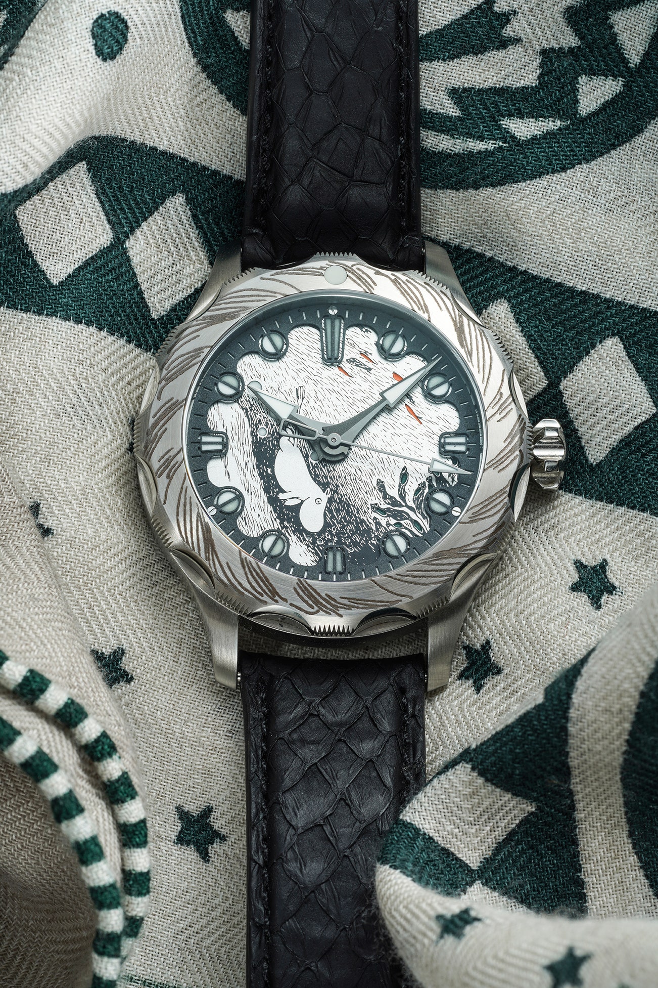 - The new diver's watch features a steel dial that reproduces a drawing from Moomin and the Comet, one among many Moon books created by Finnish author Tove Jansson. The dial design is created via a laser engraving, which is finally finished by hand. The dial is composed of several distinct sections, revealing the luminous material and the scene which includes the bubbles, seaweed, and fish. The steel chapter ring furthermore acts as another layer on top of the dial, giving a great three dimensional effect.