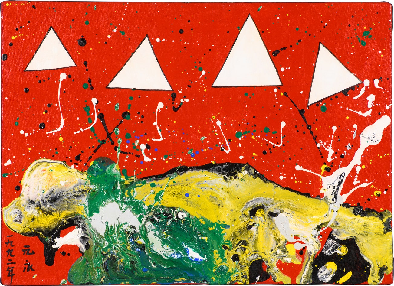 signed and dated '1992 Sadamasa [in Japanese]' lower left; further signed, titled and dated '"Four Triangles Backed in Red" [in Japanese] S. motonaga 92 1992' on the stretcher