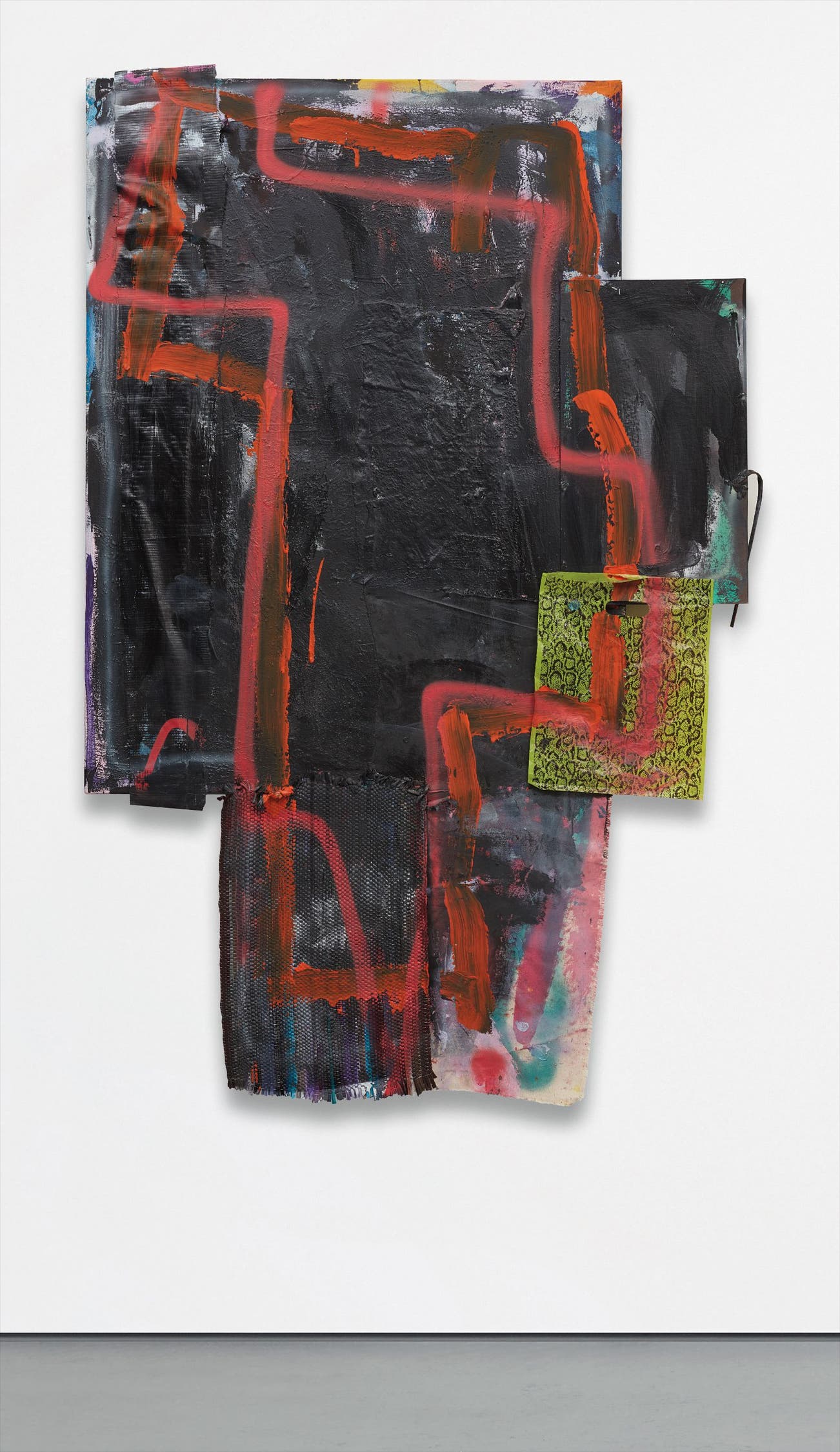 rug, spray paint, plastic bag, acrylic, canvas, paper clip, nails, board, textile, and shoelace