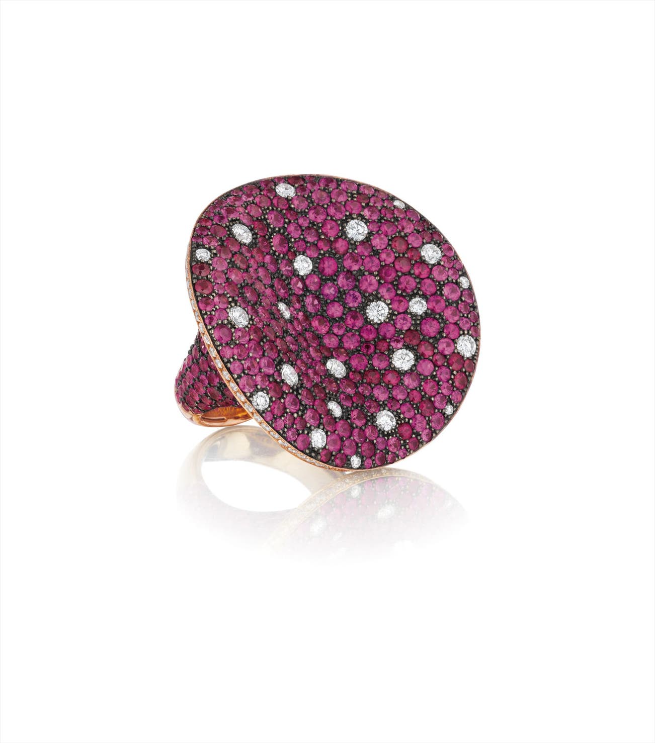 Designed as a circular undulating disc, entirely set with circular-cut rubies, further enhanced by circular-cut diamonds, to the pavé-set diamond trim border and circular-cut ruby gallery, mounted in 18K rose gold, size 7 3/4.