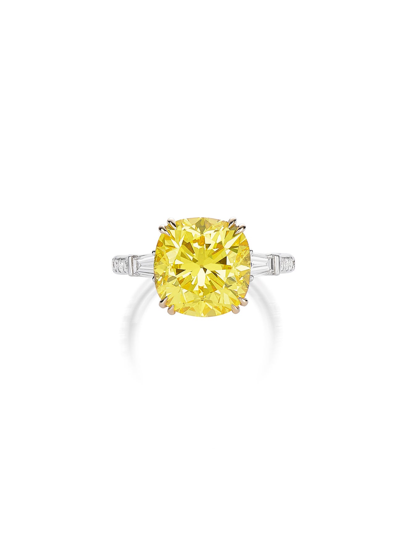 One cushion-shaped Fancy Vivid Yellow diamond, 5.32 caratsTwo tapered baguette-cut diamonds