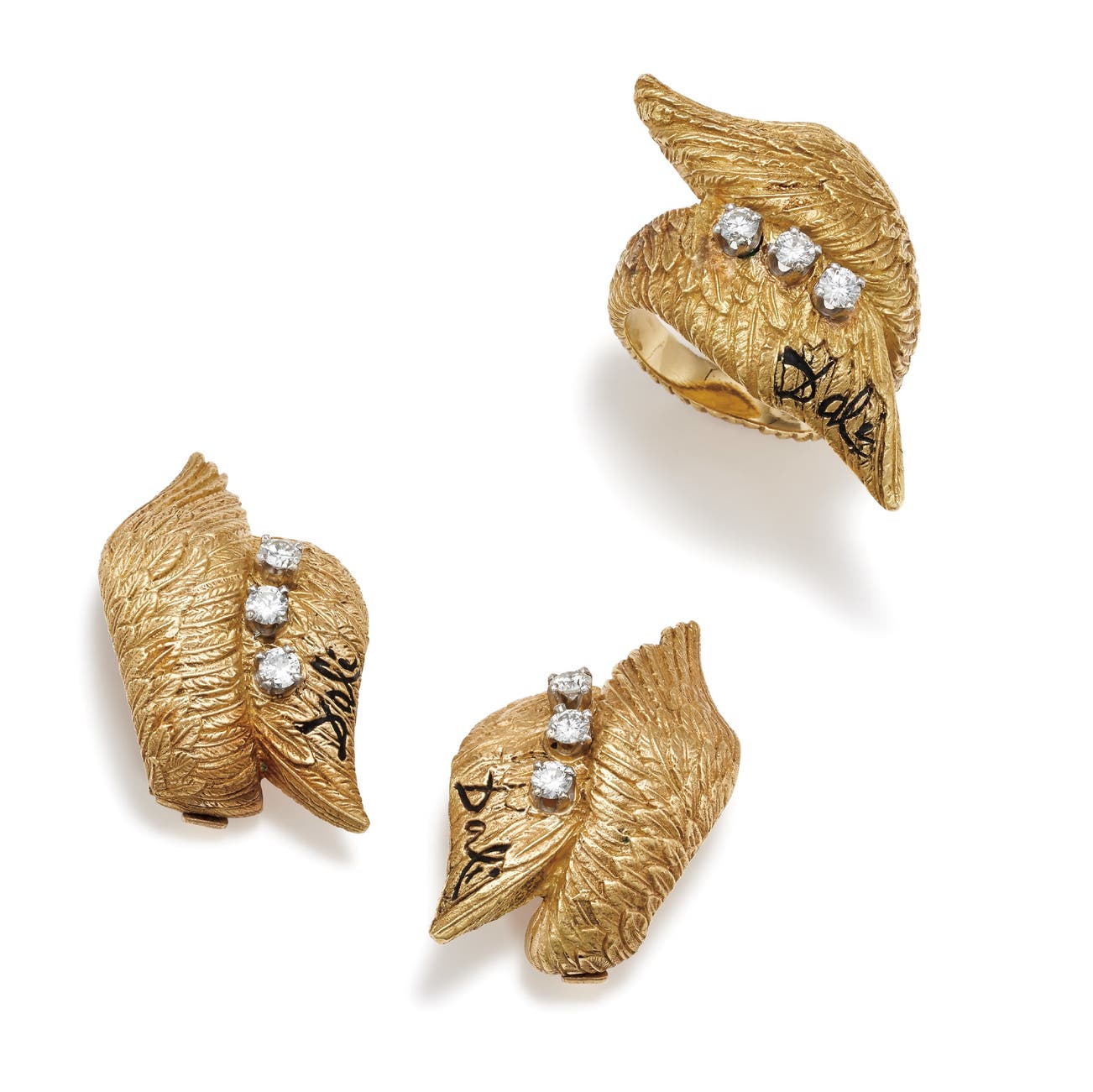 These ‘Swan’ earrings and ring were designed by 20th century Surrealist, Salvador Dali, and created by New York jewelers Eric Ertman and Carlos Alemany, who worked out of a workshop in the St. Regis Hotel. These jewels, like most of his work, relate to Dali’s exploration of the conscious and unconscious dream-like states, which are expressed through fantastic and exaggerated forms.