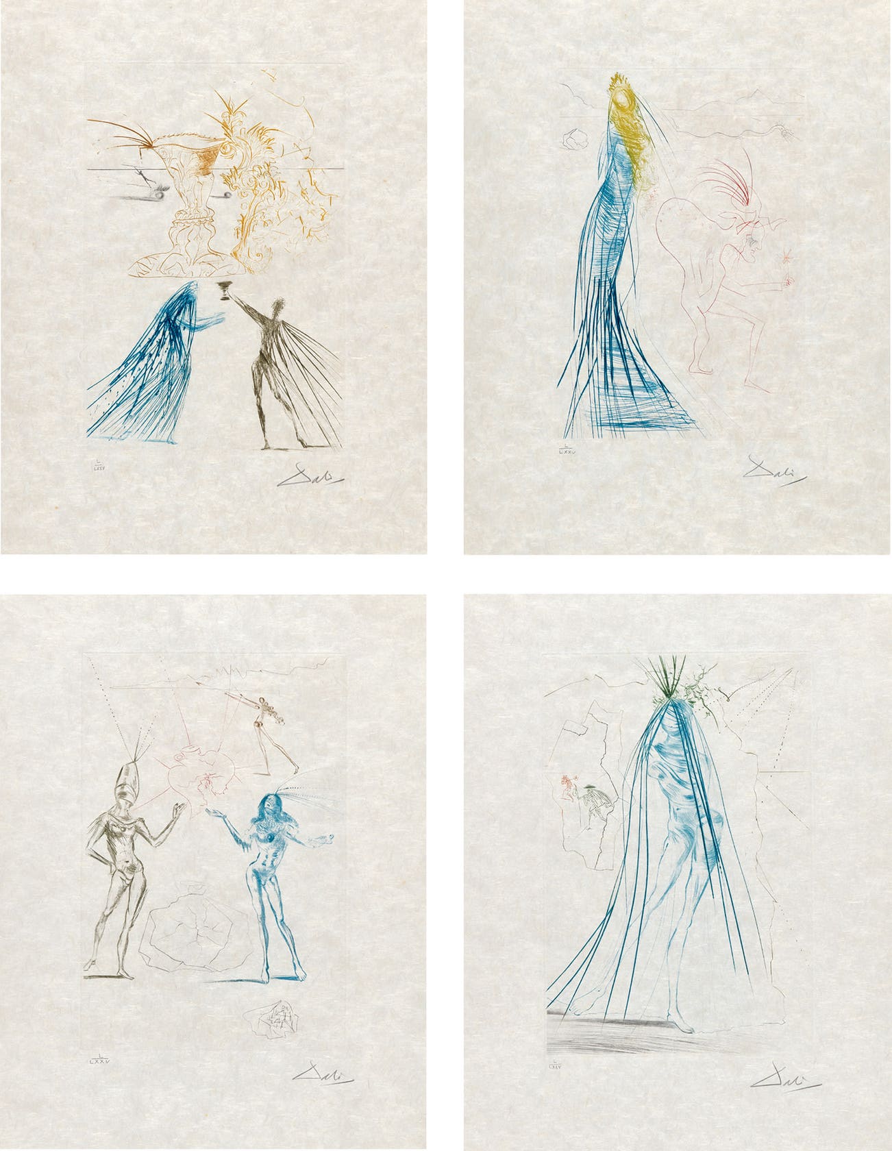 Salvador Dalí was perhaps the most broadly known member of the Surrealist movement of the early twentieth century. Heavily influenced by Sigmund Freud, the avant-garde style explored consciousness and dream-like states through exaggerated landscapes and bizarre or grotesque imagery. Using the means of painting, sculpture, printmaking, film and literature, Dalí explored these ideas with a meticulous hand and inventive wit.