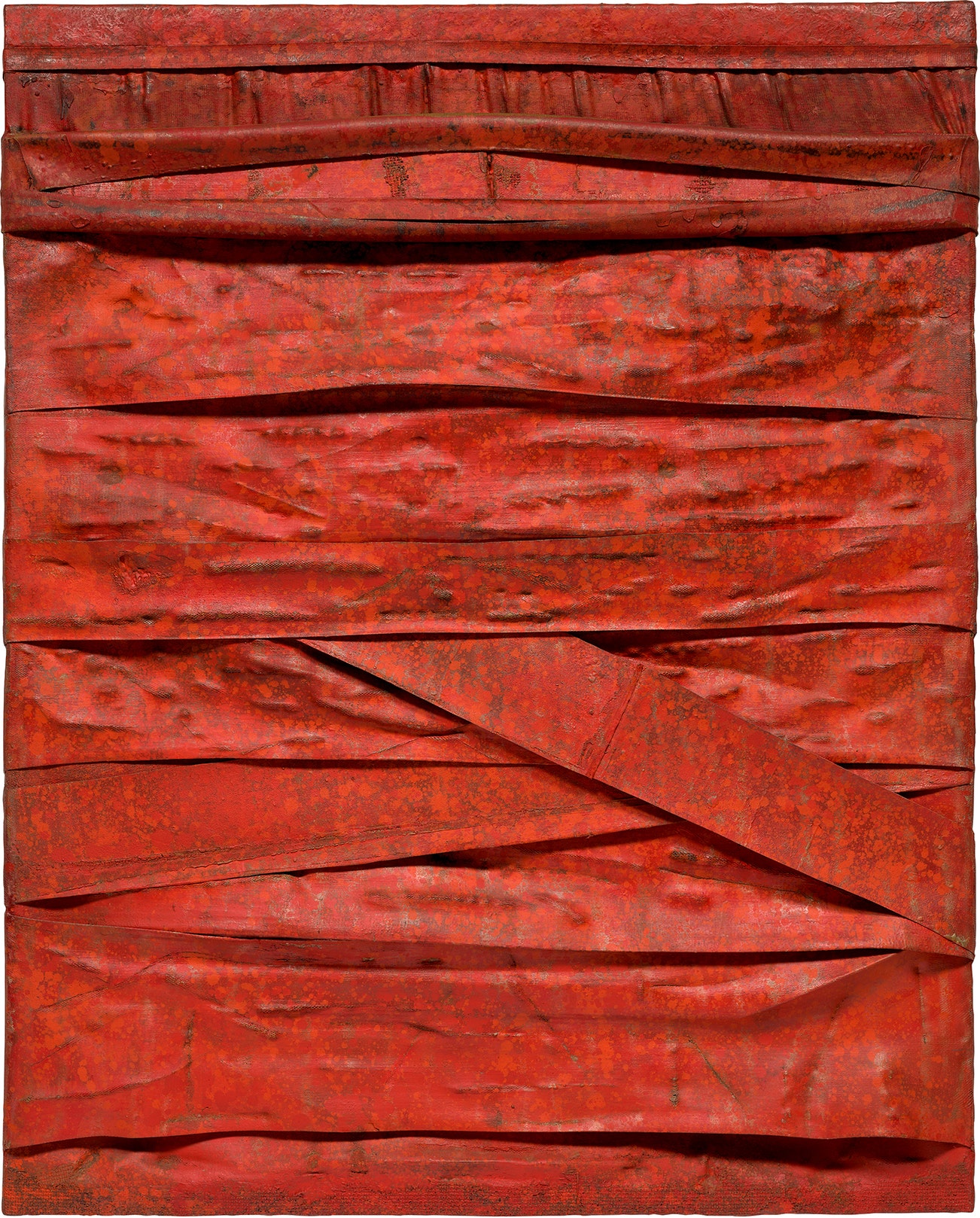 signed, titled, inscribed and dated ‘“RED FREIGHT” S. Scarpitta 1961 75” x 61” c/o Leo Castelli 4 E 77 ST NY NY’ on the reverse