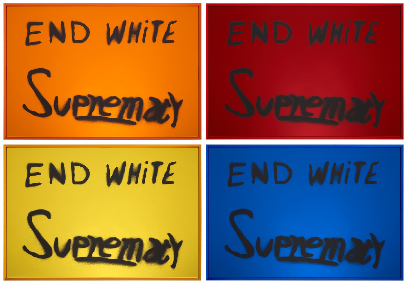 Including: End White Supremacy Mirrored (Amber); End White Supremacy Mirrored (Red); End White Supremacy Mirrored (Yellow); and End White Supremacy Mirrored (Blue)