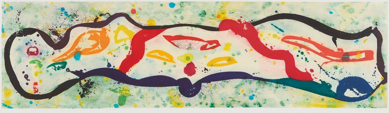 Unique aquatint in colors, on hand-colored Kozo chine collé (in watercolor and acrylic) to Rives BFK paper, with full margins.