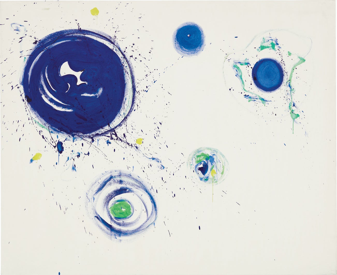 In 1960, Francis began suffering from a number of health issues leading to extended periods of hospitalization and convalescence that permeated his artistic practice and inspired his Blue Balls series. Though Francis had been drawn to the color blue since early in his career, it became the principal color in this deeply personal and expressive series, manifesting in his works as organic forms that serenely float or frantically dance against a stark white background. In a letter to his friend Yoshiaki Tono in 1961 discussing his feelings during this period of illness, Francis reflected: “I live in a paradise of hellish blue balls – merely floating, everything floats, everything floats – where I carry this unique mathematics of my imagination through the succession of days towards a nameless tomorrow... So I continue to make my machines of strokes, dabs and splashes and indulge in my dialectic of eros—objectively for myself and subjectively in the eyes of the audience” (Sam Francis, quoted in Peter Selz, Sam Francis, 1982, New York, p. 80).