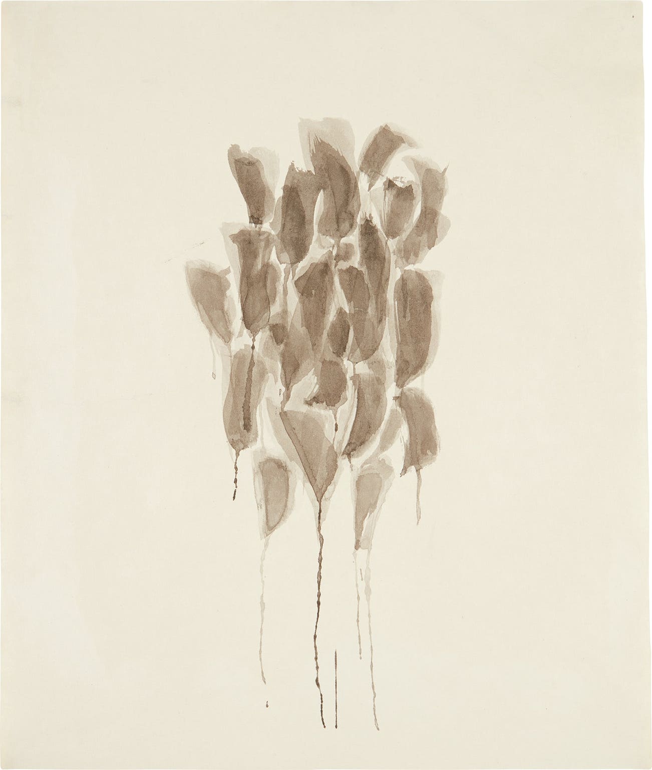 In this group of four early works on paper, Francis’ explorations into clarity and verticality are already apparent, preoccupations which would continuously be reaffirmed in the artist’s work. In Hydra, 1950, Untitled, circa 1950-52, and Untitled (Circle Entre Noir et Blanc), 1953-54, organic forms are gathered at the center of the compositions with drips flowing down the sheets, leaving a distinct sense of clarity around the papers' edges. Francis began to use drips in his work as early as 1949, a practice famously explored by Jackson Pollock as early as 1953, and Gorky by 1944. Furthermore, the four works reflect Francis’ love for working on an intimate scale, and his hand is evident in the direct and seemingly spontaneous application of medium. As Francis once said of his process of painting on paper, “Images appear, they do not come from somewhere… from the soul. It is stealing from the gods. I want to be the paper” (Sam Francis, quoted in Pontus Hulten, Sam Francis, exh. cat. Kunst-und Ausstellungshalle der Bundesrepublik Deutschland, Bonn, 1993, p. 26).