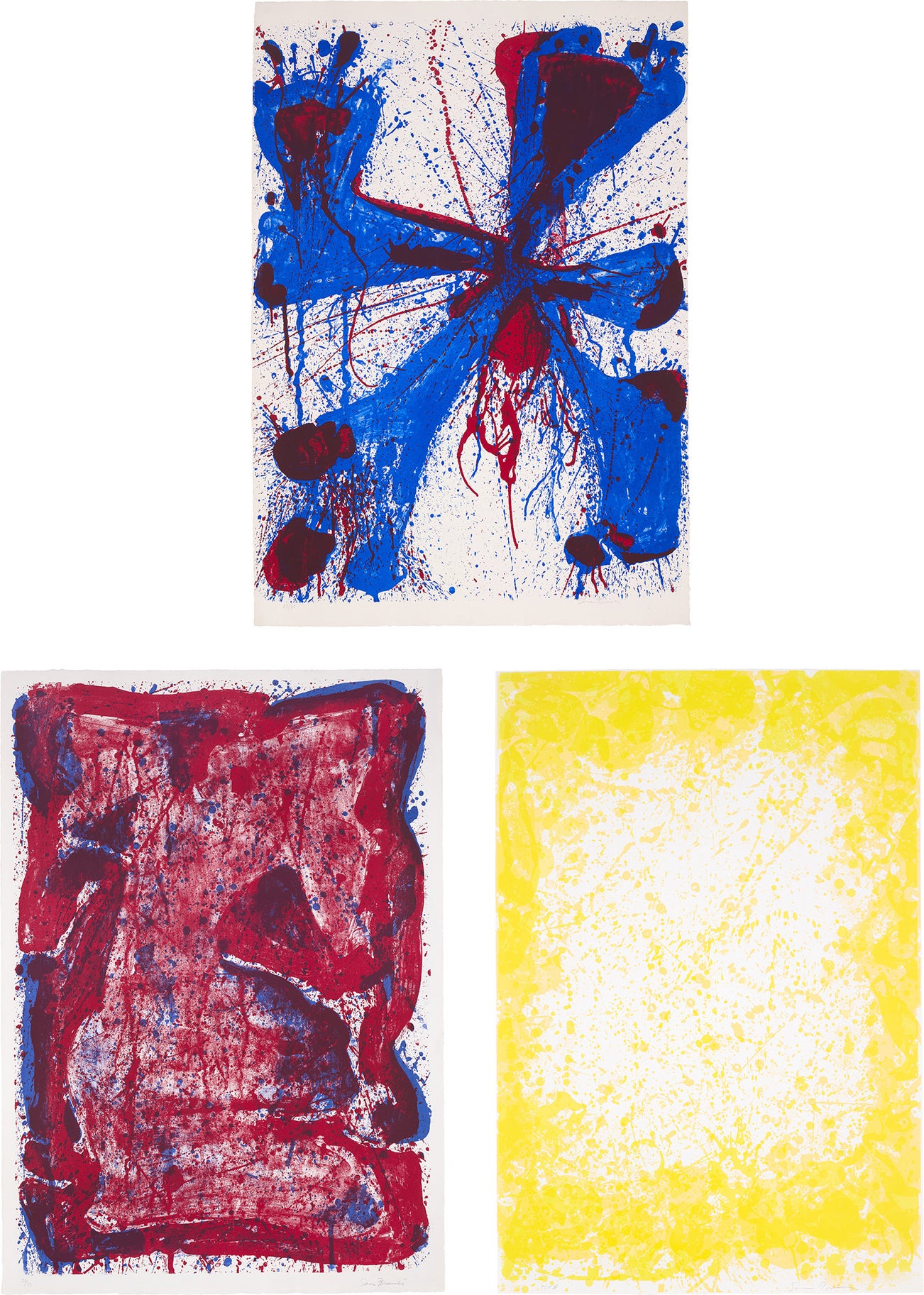 Two lithographs in colours, and one unique screenprint in yellow, on BFK Rives and Arjomari papers, the full sheets and with margins.