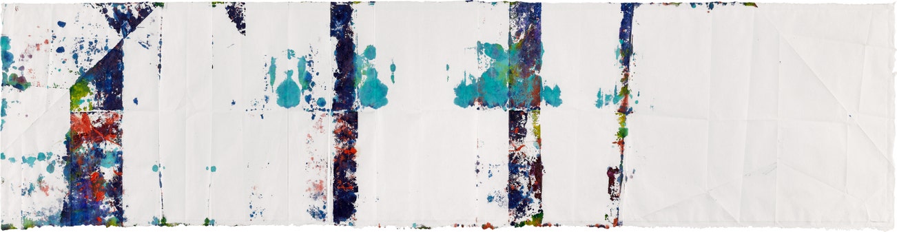 Mixed media monotype in colors, on thin wove paper, the full sheet, framed.