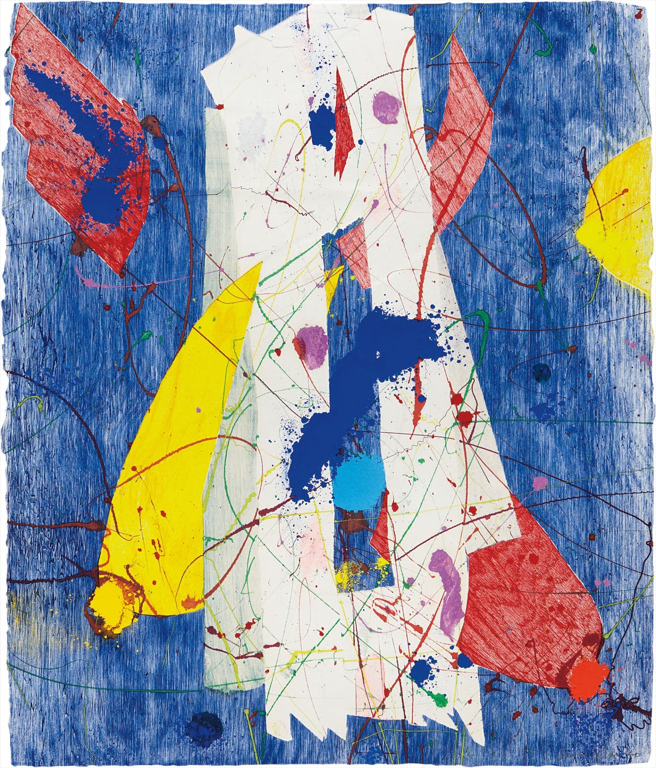 Monotype with oil paint, powdered pigment and ink in colors with embossing, on handmade paper, the full sheet,